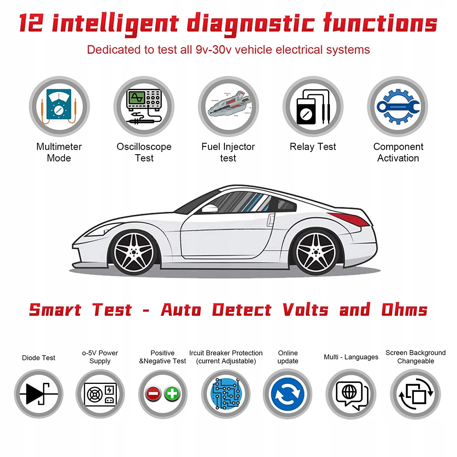 [Smart Test & Amp; Positive/Negative Test] коли зонд, підключений до інструменту тестування електричного автомобіля, вимірює напругу, опір, позитивну/негативну полярність, він автоматично перетворюється в миттєвий Автоматичний діапазон, інтелектуальне судження без ручного вибору, і відображає відповідне значення параметра і підказку на РК-екрані HD. Оснащений 20-футовим кабелем, який швидко допоможе вам діагностувати стан вашого автомобіля без необхідності відкривати проводку.е>