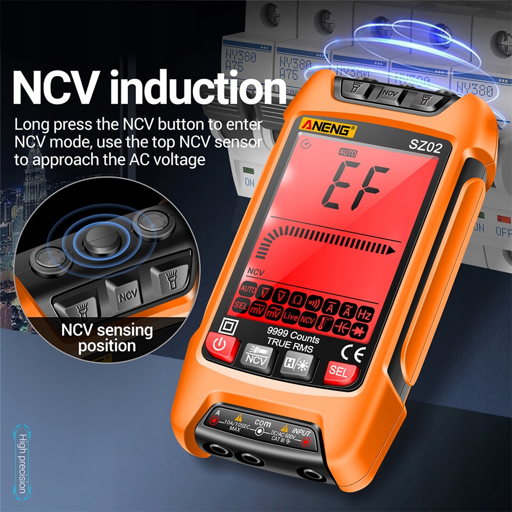 тривале натискання кнопки NCV для входу в режим NCV, використовуйте верхній датчик NCV для наближення до напруги змінного струму.