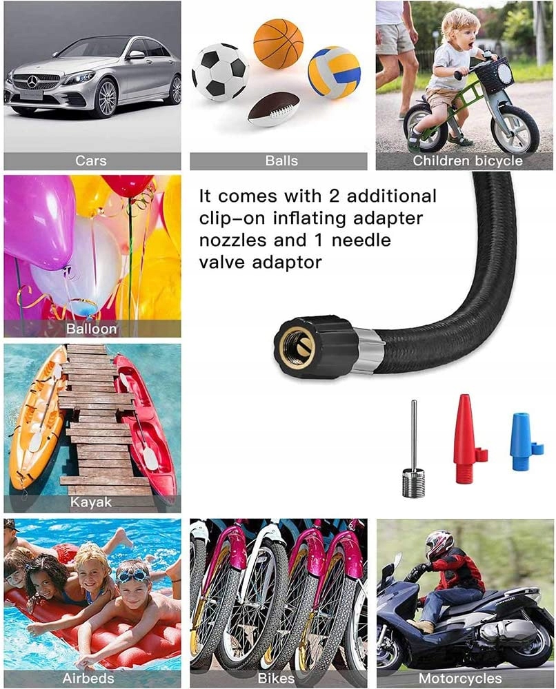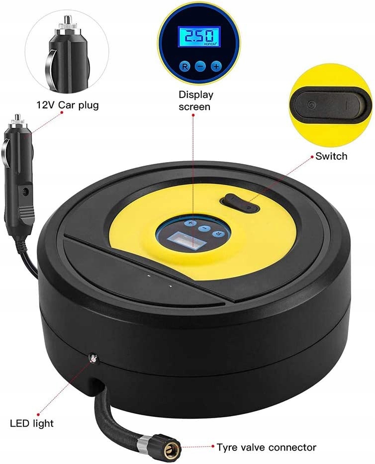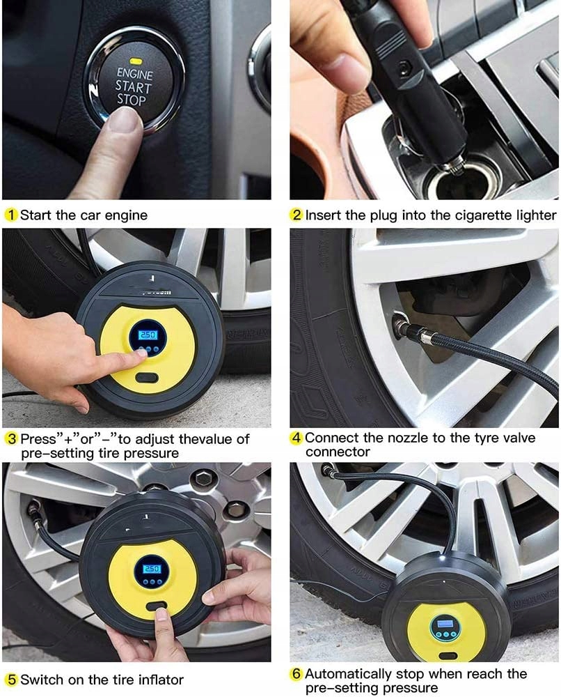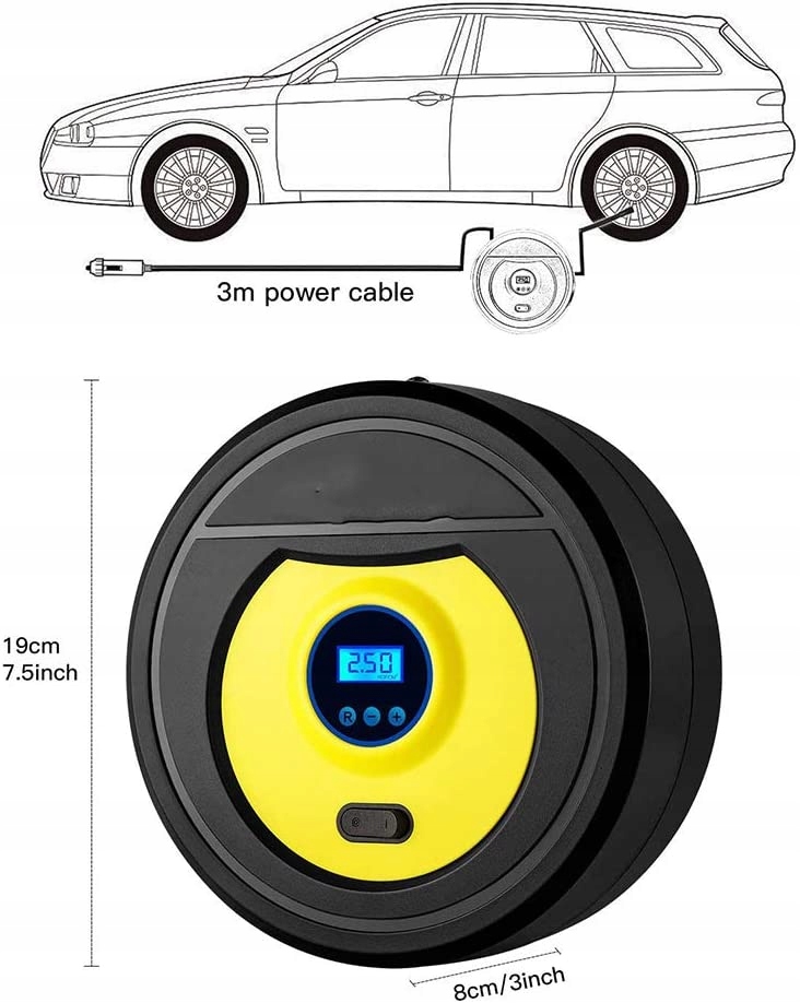 швидке завантаження живлення подається від автомобільного прикурювача 12 В з кабелем 3 м.накачайте автомобільні шини від 0 до 35 фунтів на квадратний дюйм менш ніж за 5 хвилин, щоб допомогти цьому atwego опустити насос фактичний час залий від великої шини. манометр і насос може гнучкий в і рубіновий клапан який cile або si для безпечного надування автоматичне зчитування при подачі в шину який ви хочете накачати просто встановіть на необхідний PSI. Після осипання правильного PSI електричний шинний насос для автомобілів автоматично польського багатофункціональний автомобільні насоси для шин в комплекті 3 Rone адаптери клапанів дикий навіщо підходить для накачування шин на автомобілях велосипеди мотоцикли баскетбольні піки та інші надувні предмети зручний автомобільний аксесуар електричний шинний насос оснащений додатковим 1 Адаптер для голчастого клапана 2 насадки адаптера для накачування 2 запобіжника 2 протипилові ковпачки для клапанів шин 1 сумка для зберігання 1 Керівництво obsugi moe не буде надувних предметів вбудований вбудований світлодіодний навіть коли ви працюєте в темному гаражі, припарковавшись під пошкодженими вуличними ліхтарями або зламавшись поруч з безвітряною сільською дорогою або шосе