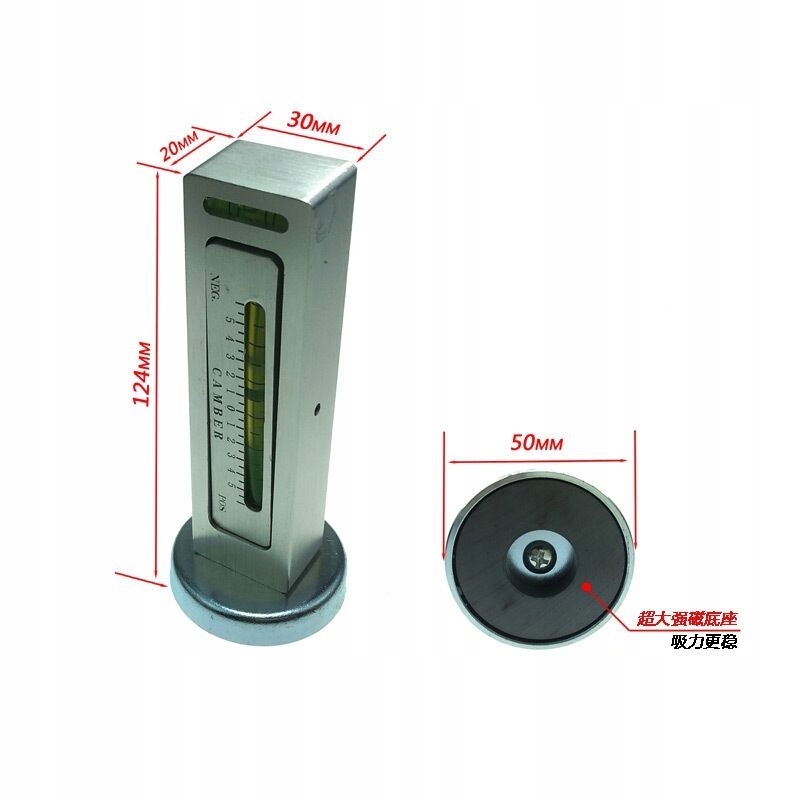1. Він вимірює кут нахилу і повороту маточини колеса або гальмівного диска. 2. Магнітний датчик кріпиться до маточини або дискового гальма. 3. Він має просте регулювання рівня від -5 градусів до 5 градусів. 4. Легко читати і зручно працювати. 5. Підходить для точної перевірки колеса і кута нахилу; 6. Дозволяє регулювати для підтримки правильного положення коліс і навіть зносу шин; 7. Пристрій для економії часу і грошей 8. Використовуйте цей простий рівень, щоб відновити налаштування розвалу автомобіля після ремонту або установки амортизатора.специфікація:
