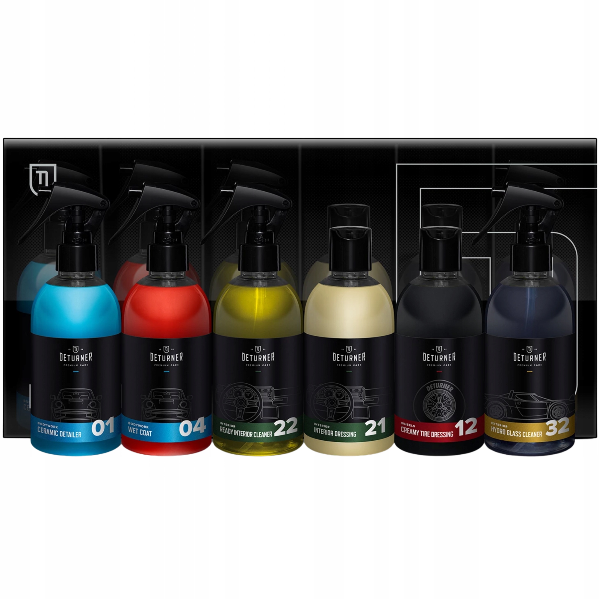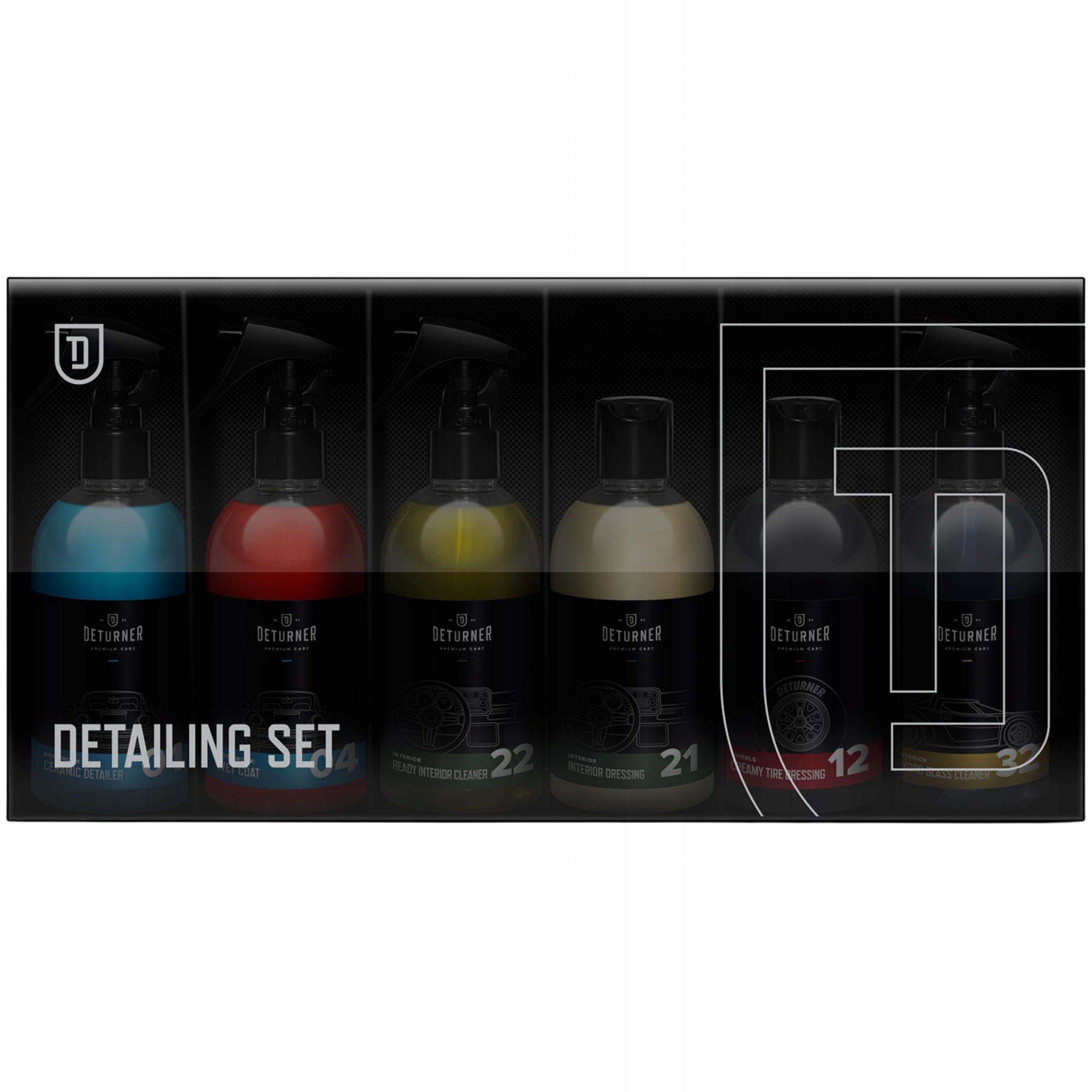 - це косметичний набір для базового догляду за автомобілем, який містить 6 продуктів об'ємом 250 мл.ідеально підходить для будь-якого шанувальника деталізації, новачка або шукає готові рішення. Він також підійде в якості ідеї подарунка для будь-якого випадку. Продукти були упаковані в індивідуальну упаковку, створену за проектом бренду deturner.