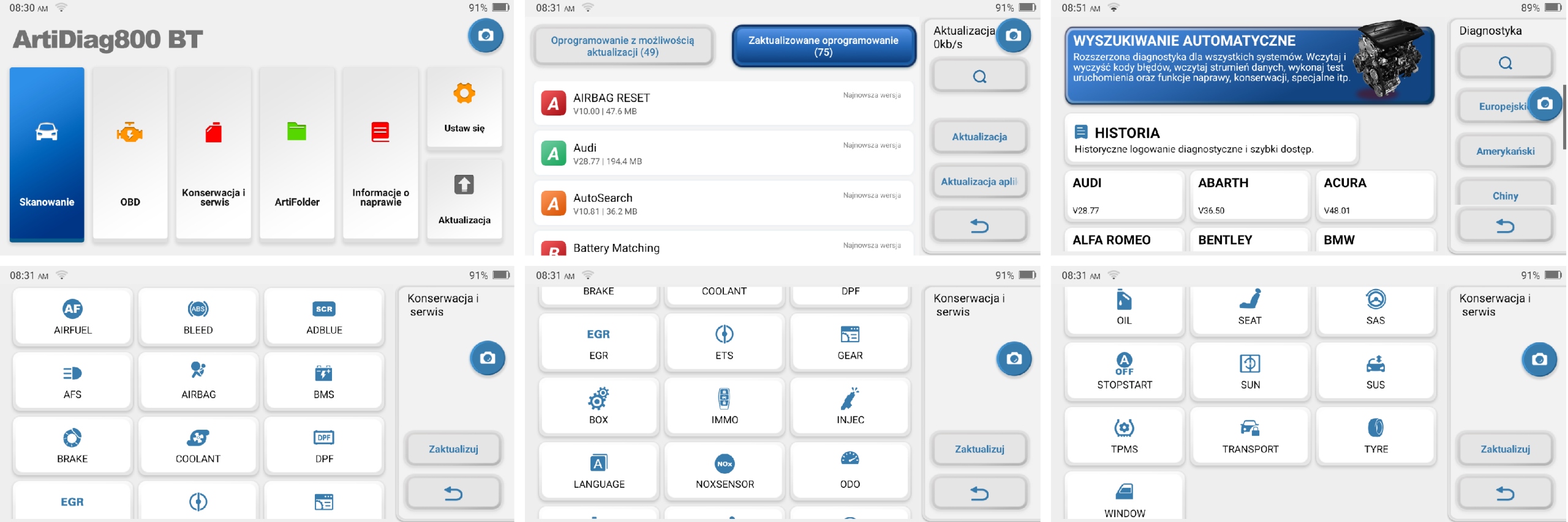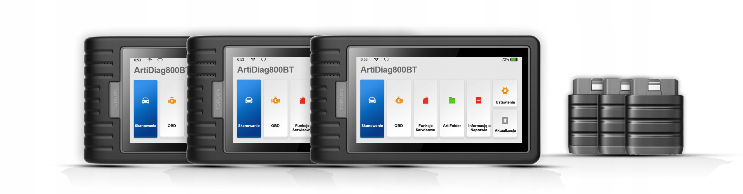 Тестер - це автономний прилад для майстерні, оснащений сенсорним екраном діагоналлю 6 дюймів, броньований корпус для майстерні у формі ковпака! Тестер має повний доступ до всіх модулів керування практично в кожному автомобілі, а також до 28 сервісних функцій. Модель ArtiDiag800BT працює на базі операційної системи Android. Diagnoskop повністю працює польською мовою