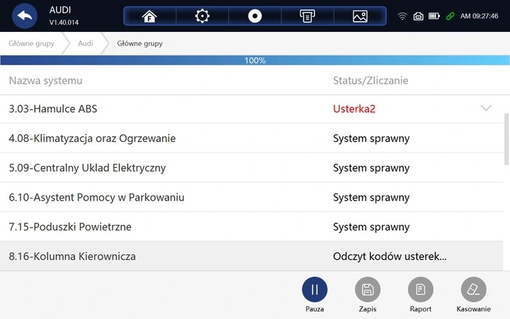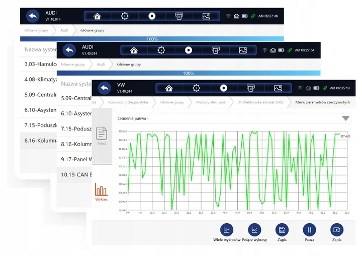 Тестер — автономний цеховий прилад, оснащений 10-дюймовим сенсорним екраном, броньований, водонепроникний, цеховий кожух! Він працює на базі операційної системи Android і забезпечує бездротову діагностику через інтерфейс Bluetooth. Діагноскоп працює польською мовою.