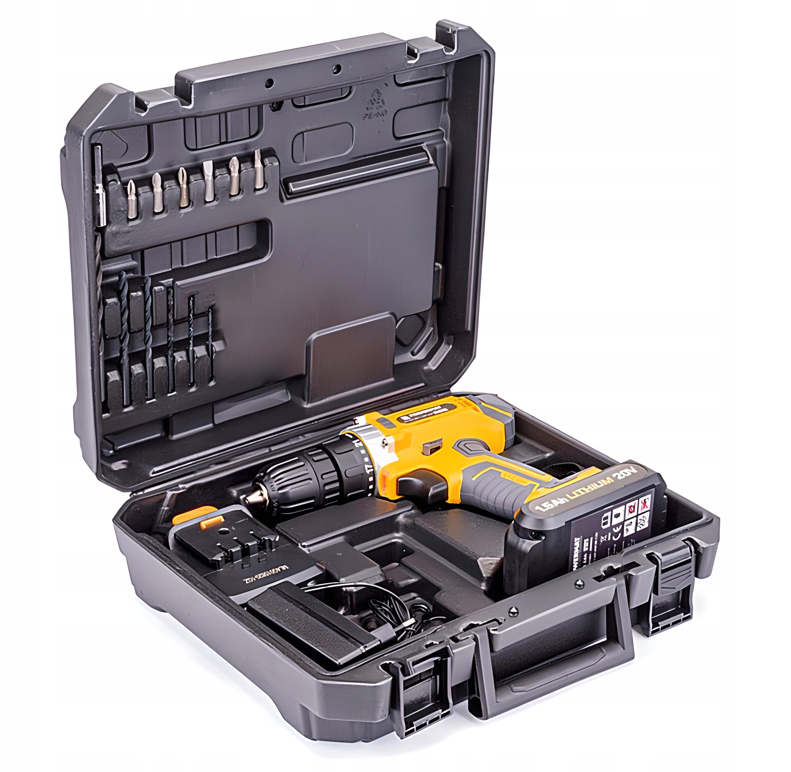 в комплекті 2 літій-іонних акумулятора 20V + зарядний пристрій + набір свердел + потужний валізу