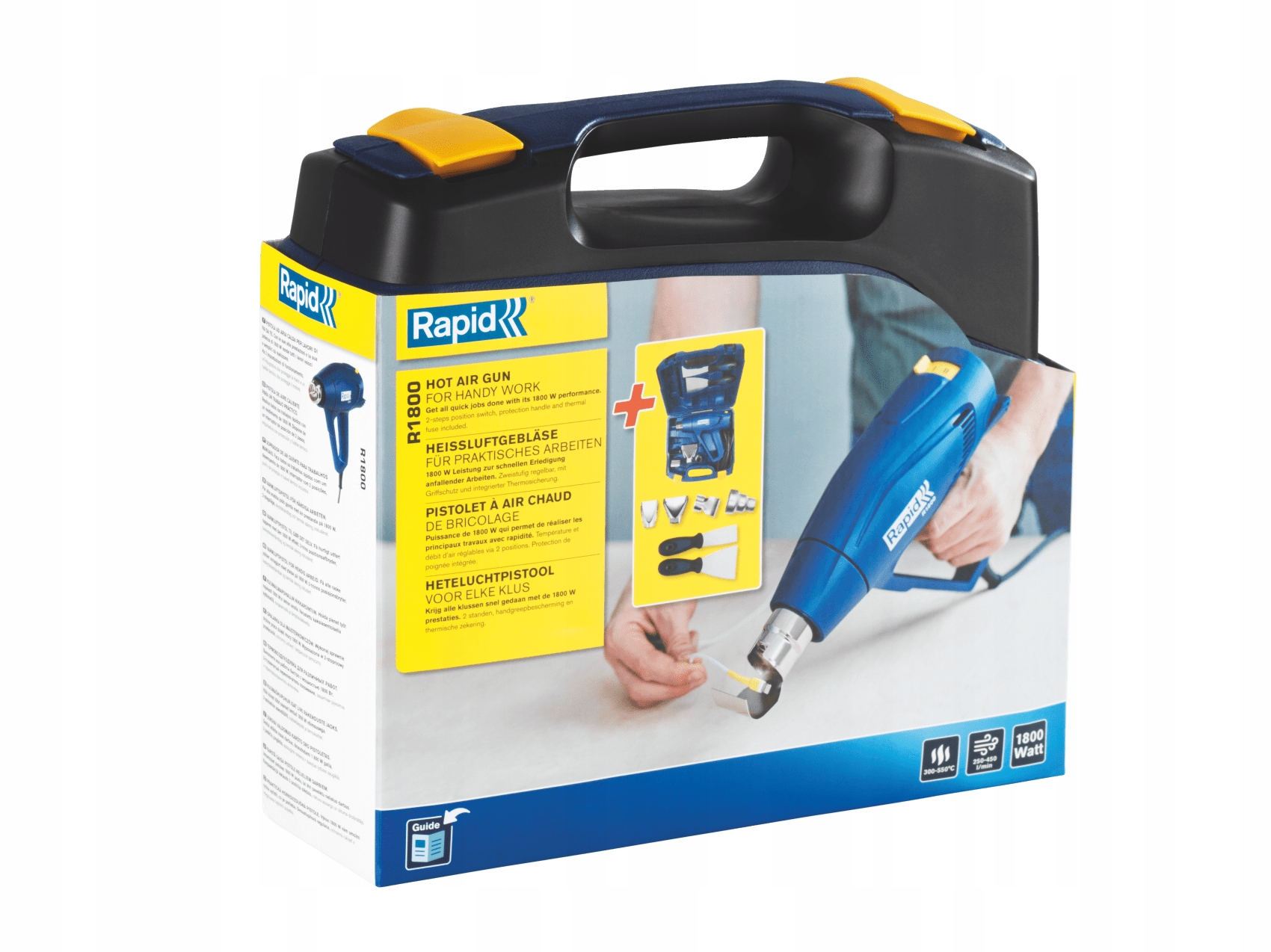 R1800 — це простий тепловий пістолет, розроблений спеціально для таких робіт, як розморожування, натирання воском лиж і сноубордів, видалення бур’янів на під’їзді та багато інших повсякденних завдань вдома, у дворі чи в гаражі. Завдяки потужності 1800 Вт , двоступеневому регулюванню температури (300°C і 550°C) і регульованому потоку повітря R1800 виконує роботу швидко і точно . Він також має безпечну ручку, яка підвищує відчуття безпеки користувача.