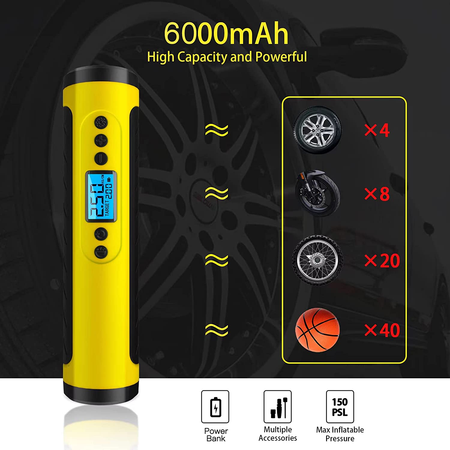 продукт чорного кольорупортативний повітряний компресор длянакачування шин,бездротовий шинний насос150PSI для автомобілів зцифровим манометром іаварійним світлодіодним світлом,електричний повітряний насосдля автомобілів, велосипедів, мотоцикли, м'ячі. продукт чорного кольору!!!