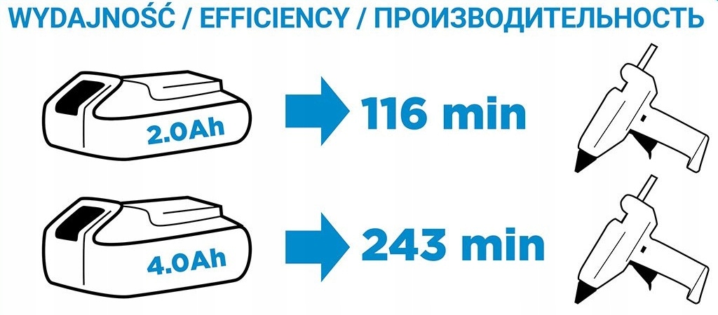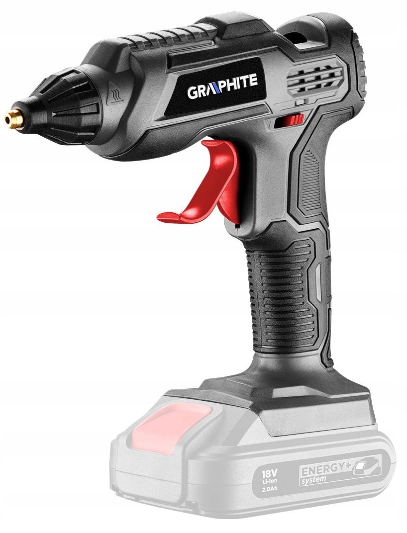 Клейовий пістолет від торгової марки GRAPHITE , що відноситься до серії акумуляторних інструментів Energy+. Сумісний з літій-іонним акумулятором 18 В, живиться від патронів діаметром 11 мм, які нагріваються до 160 - 210°C. Час досягнення максимальної температури становить 3 хвилини , продуктивність приладу 8 г/хв.