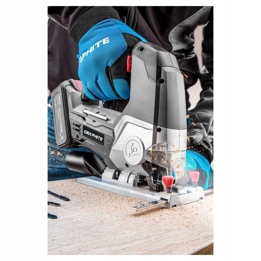 електролобзик акумуляторний Energy + 18V, Li-lon, без акумулятора GRAPHITE лобзик GRAPHITE, що працює з батареями 18V Li-Ion Graphite Energy+. Пристрій призначений для точного і швидкого різання дерева і металу з максимальною товщиною 80 мм і 10 мм відповідно. Система регулювання обертів дозволяє працювати зі швидкістю від 0 до 2400 ходів в хвилину.е>лобзик має алюмінієву ніжку з регульованим кутом нахилу від 0° до 45° вправо і вліво. Він має функцію 3-ступінчастого регулювання розміру маятникового руху, що дозволяє збільшити швидкість різання в обраних матеріалах.е>