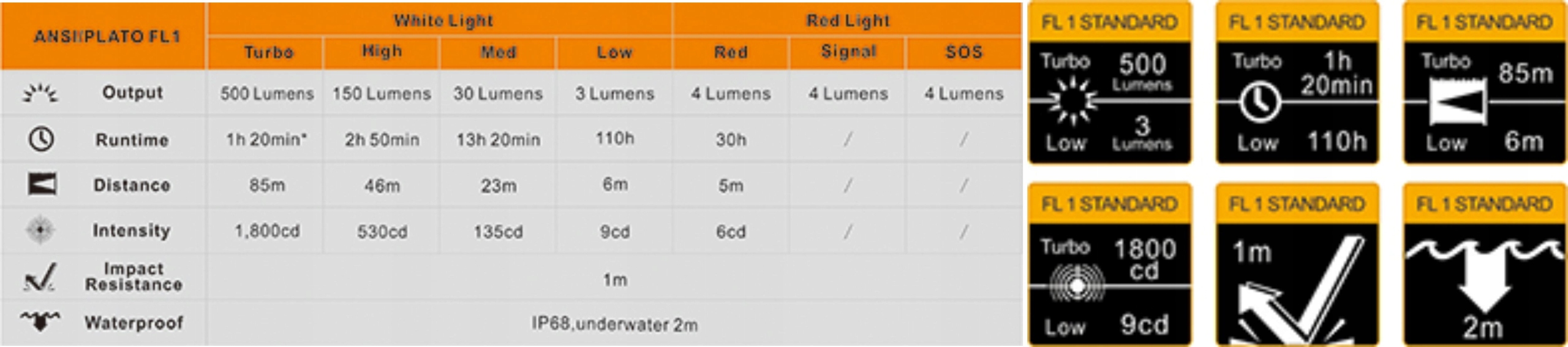Відповідає вимогам ANSI NEMA/FL1. Ліхтарики Fenix перевірені на відповідність вимогам NEMA/FL1 (стандарт ANSI). Крім того, кожен виріб проходить серію випробувань щодо відповідного кольору світла, стійкості до корозії, стійкості до механічних пошкоджень, температурної стійкості та тривалості роботи пристрою.