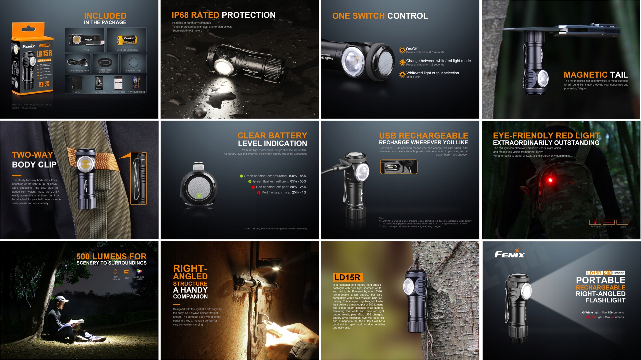 Ручний кутовий ліхтарик Fenix LD15R має вражаючу потужність: 500 люменів, прихованих у маленькому 40-грамовому ліхтарику, живиться від звичайних батарей CR123A або батареї Fenix RCR123 16340. Це ідеальний інструмент освітлення для дуже вимогливих туристів, бігунів, спелеологів, скелелазів, рибалок... і, перш за все, любителів виживати та любителів бушкрафту. Він добре працюватиме там, де для виживання важливі невеликі розміри та мала вага. Завдяки невеликому розміру ми можемо сховати його будь-де - навіть у кишені штанів. Ми можемо використовувати його як ручний або велосипедний ліхтарик, прикріпити до пояса чи рюкзака завдяки затиску. Область буде освітлена 4 режимами білого світла та 2 режимами червоного світла .