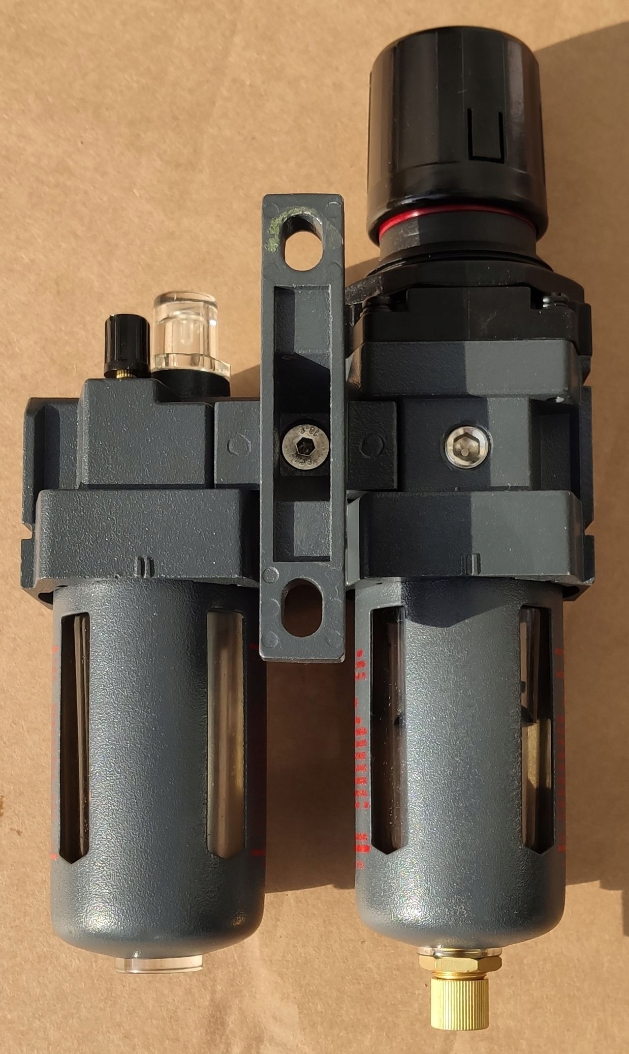 пристрій має редуктор тиску, фільтр і маслянку з вбудованим манометром.е>
