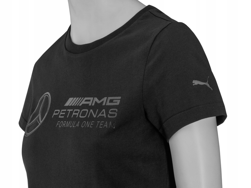 спортивний дизайн в поєднанні з високим комфортом носіння! Чорна жіноча футболка з високоякісної бавовни з блискучим принтом: MERCEDES - AMG PETRONAS FORMULA ONE TEAM.е>