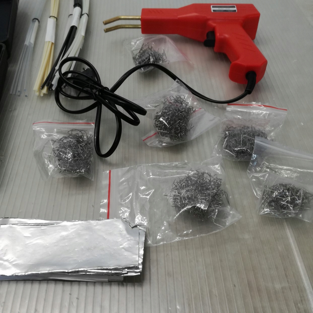 600 шт.скріпок і 56 шт. пластикових зварювальних стрижнів: цей набір інструментів для ремонту зварювання призначений для ремонту пластикових деталей автомобіля, не пошкоджуючи поверхню автомобіля, він дуже міцний і має тривалий термін служби.ударостійкість і кручення після ремонту.затискачі з нержавіючої сталі не іржавіють.