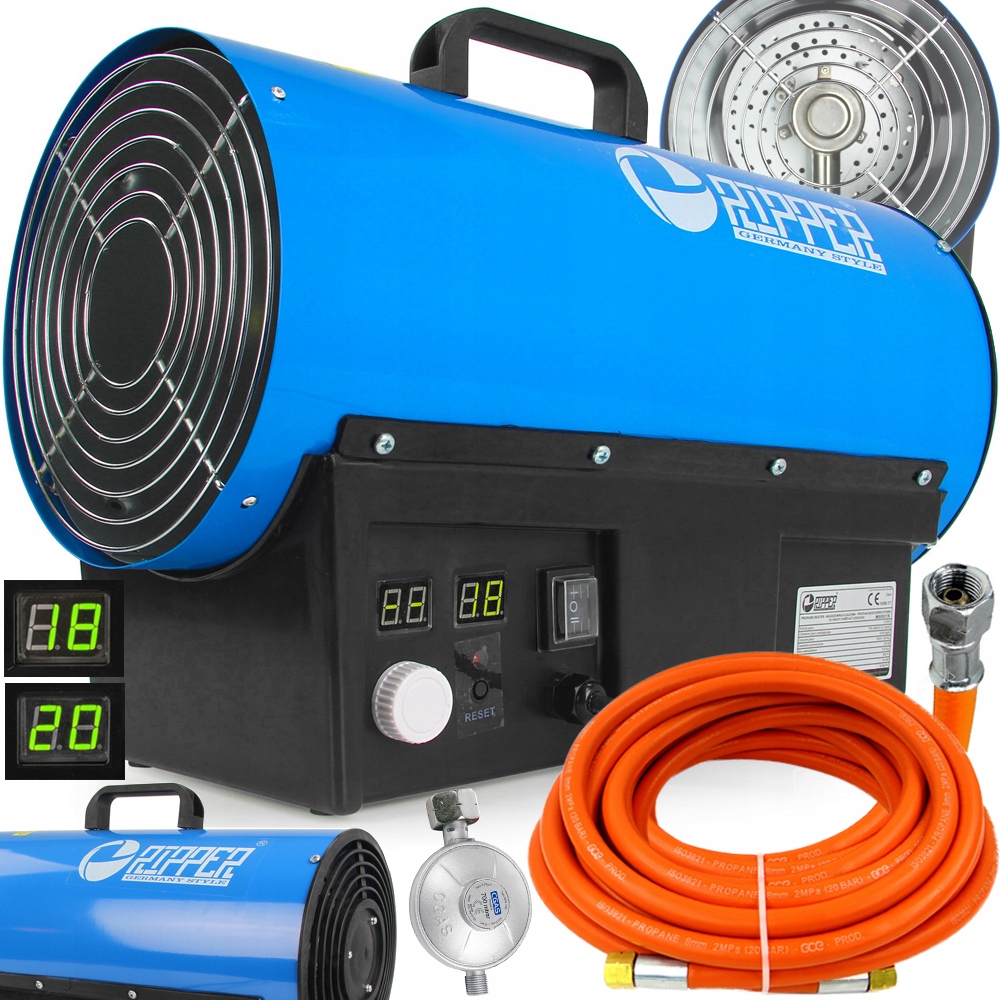 потужність:20 кВт ► термостат з РК-дисплеєм►низьке споживання газу: 0,98 кг/год►повітряний потік: 500 м^3/год