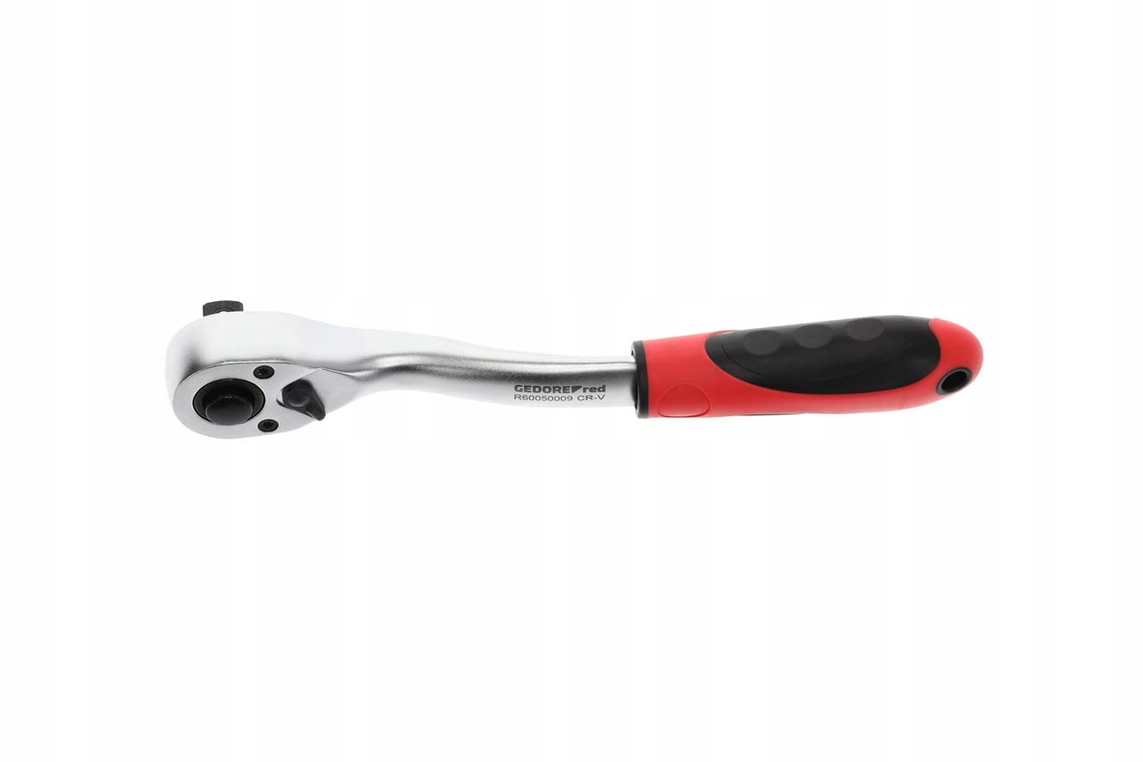 крапка : Надміцна тріскачка для відкручування тугих/іржавих гвинтів, ідеальна в поєднанні з динамометричними ключами Gedore та торцевими головками, вигнута версія для гвинтів з глибоким розташуванням, обертання за годинниковою стрілкою та проти годинникової стрілки перемикається важелем із зуби крупнозубчасті на 36 зубів, кут повороту 10°, практична кнопка для фіксації та швидкої заміни аттачменів, ергономічний 2-компонентна рукоятка забезпечує безпечну передачу потужності, овальна головка, матова хромована поверхня, компактний розмір для зберігання, для вставок торцевого ключа, з’єднувачів тощо з квадратним кутом відповідно до DIN 3120 - C 12.5, ISO 1174, Комплект поставки: 1 x реверсивна тріскачка Gedore червона, 1/2 дюйма, з кнопкою розблокування, ручка 2K, трубка сталь, розмір: 255 мм, червоний/чорний, R60050009 / 3300411