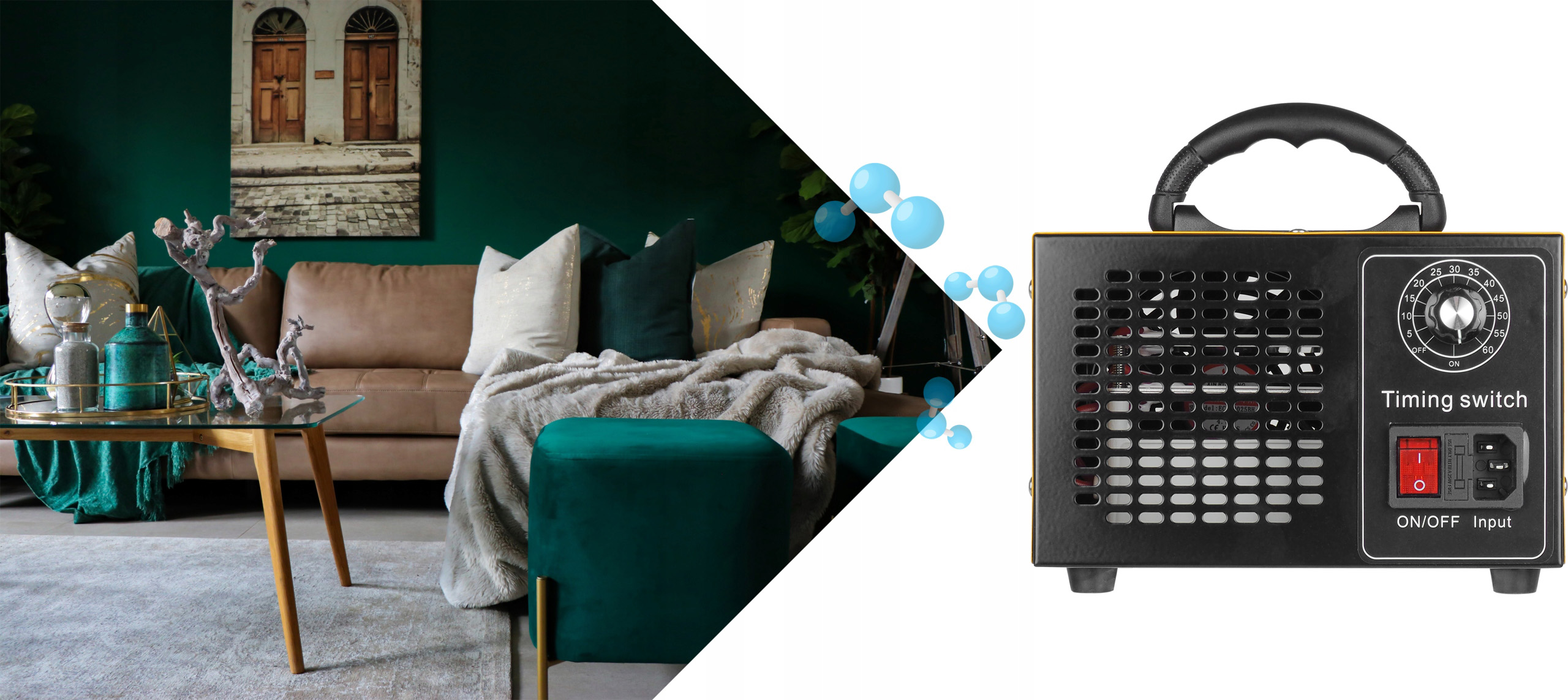 Озонатор ефективно видаляє неприємні запахи з різних поверхонь, таких як автомобілі, житлові та промислові приміщення. Озон розщеплює молекули, що викликають запах, забезпечуючи свіже та чисте повітря.