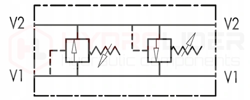 приєднайте одну сторону V1 і V2 до напірних ліній, наприклад, в гідравлічному розподільнику. Аналогічні виходи з іншого боку V1 і V2 до з'єднувальних портів приймача, наприклад, приводу подвійної дії або гідравлічного двигуна.е>