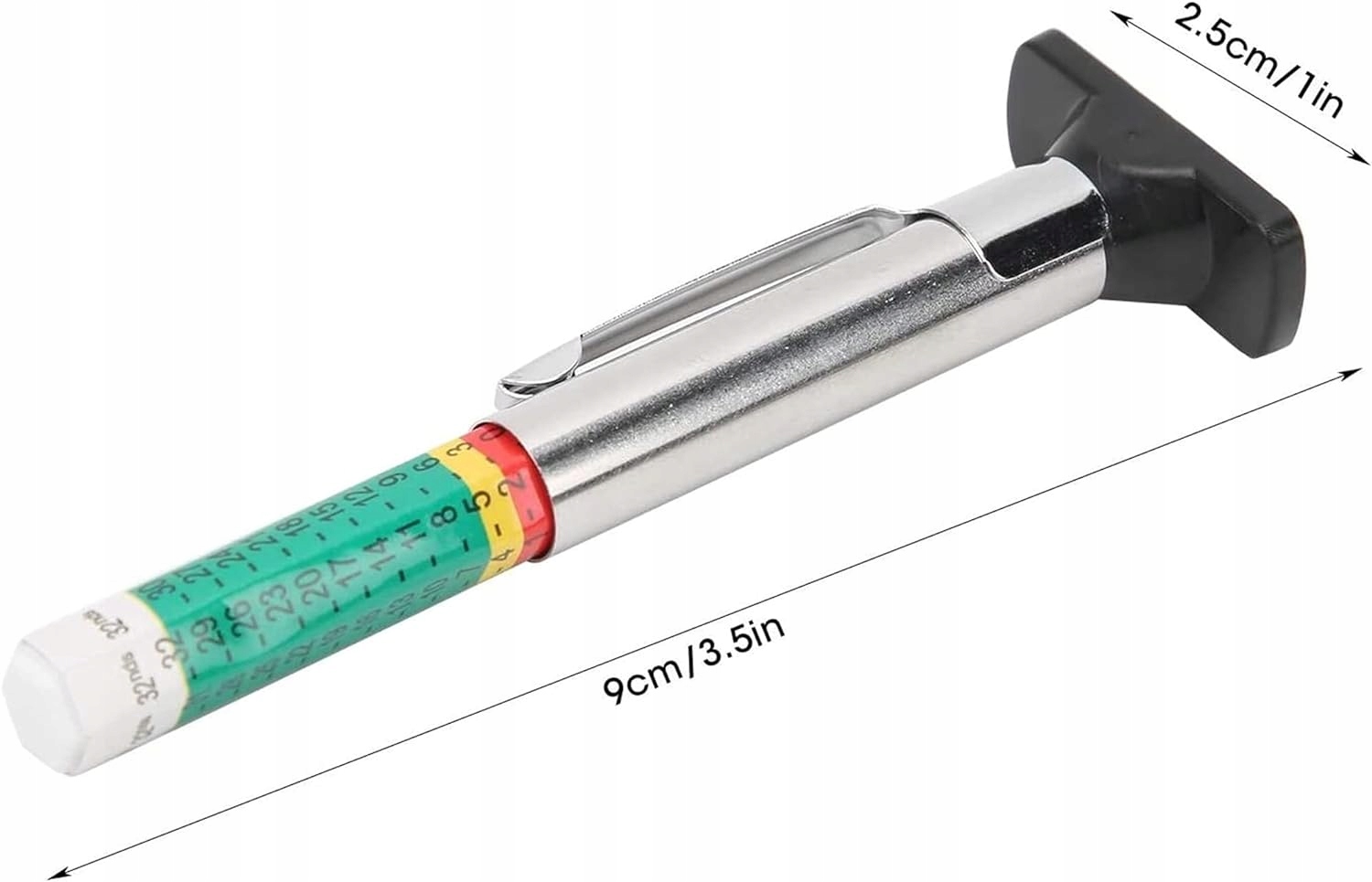 Носіть його з собою та використовуйте будь-де, де є кишеньковий затиск, щоб полегшити носіння вимірювача глибини протектора шини. Виготовлений з високоякісної нержавіючої сталі та матеріалу Abs, що робить його та має високу надійність. Універсальний тип можна використовувати для всіх типів автомобільних шин, тож вам не доведеться турбуватися про проблему неадекватних можливостей. Завдяки чіткій цифровій ідентифікації для легкого тестування використовуйте циліндричну вимірювальну лінійку для більш точного тестування. Діапазон глибини вимірювання становить 025 мм, що можна точно виміряти та має високу практику.