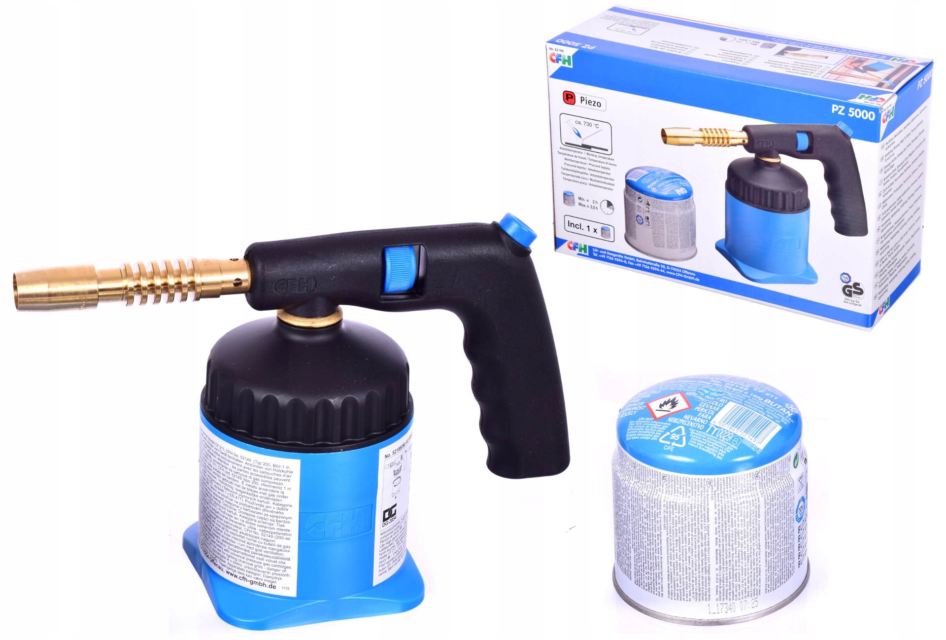 професійна пальник німецької фірми CFH з ручкою спеціальної форми для роботи з пристроєм однією рукою. Високоефективна латунна пальник, ідеально підходить для м'якої і твердої пайки до 1750 °C, для виконання ремонтних, монтажних, DIY робіт, випалу фарби, видалення бур'янів, очищення деревини від полум'я, лудіння, обробки пластмас а також для розпалювання гриля. Крім того, він має п'єзо-запалювання для автоматичного запалювання. В комплект входить газовий картуш!