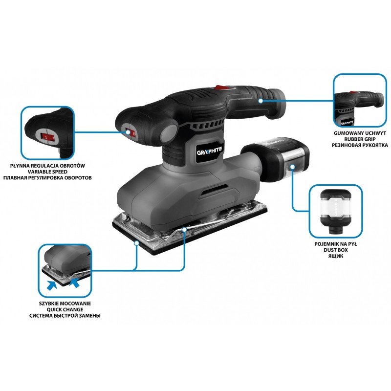 Технічні дані: Загальні розміри (ширина x висота x довжина) 12,00 x 18,50 x 30,00 см Вага 2,51 кг Бренд GRAPHITEPKWiU 28.24.11.0 Потужність 260 Вт Система кріплення Затискачі для наждачного паперу Хід коливання 0,8 мм Гарантія 3 роки