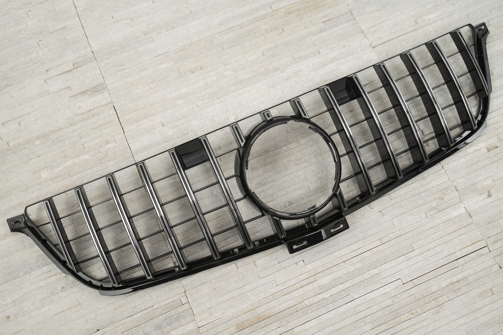 <е> Передня решітка, модель GT / PANAMERICANA призначений для MERCEDES ML W166 2011-2015 (версія без заводської камери). е>виділений гриль розроблений в стилі, характерному для автомобілів сегмента GT. Решітка радіатора прикрашена широкими хромованими перекладинами, які обов'язково нагадують вселяють благоговіння, потужні автомобілі вищого класу. Елемент вражає своїм спортивним характером, а блиск хромованих елементів надає йому елегантність, що робить його ідеальним поєднанням з вражаючим дизайном Mercedes. е>