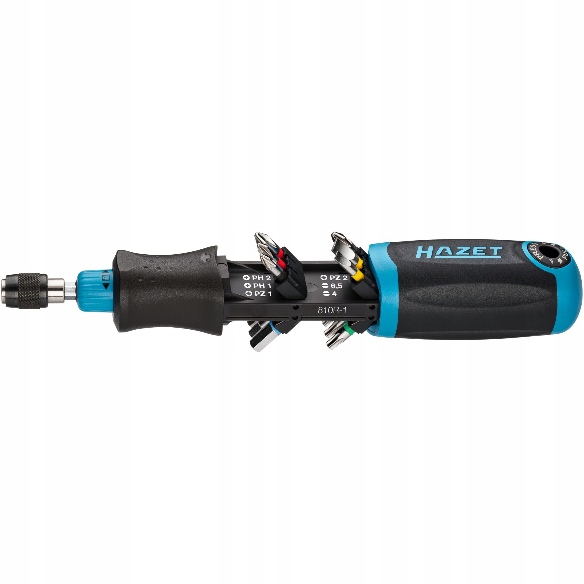 - регулювання за годинниковою стрілкою / проти годинникової стрілки з обертовим кільцем, центральне нейтральне положення з храповим механізмом дозволяє вкручувати гвинти без функції храповика