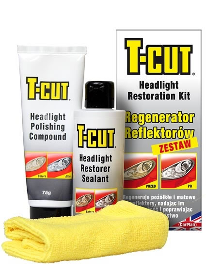 набор из двух продуктов t-Cut Headlight Restoration Kit включает в себя специально разработанную полировальную пасту и фиксатор. Эти продукты позволяют эффективно восстанавливать затуманенные, поцарапанные и пожелтевшие автомобильные фары, чтобы они снова выглядели "как новые".