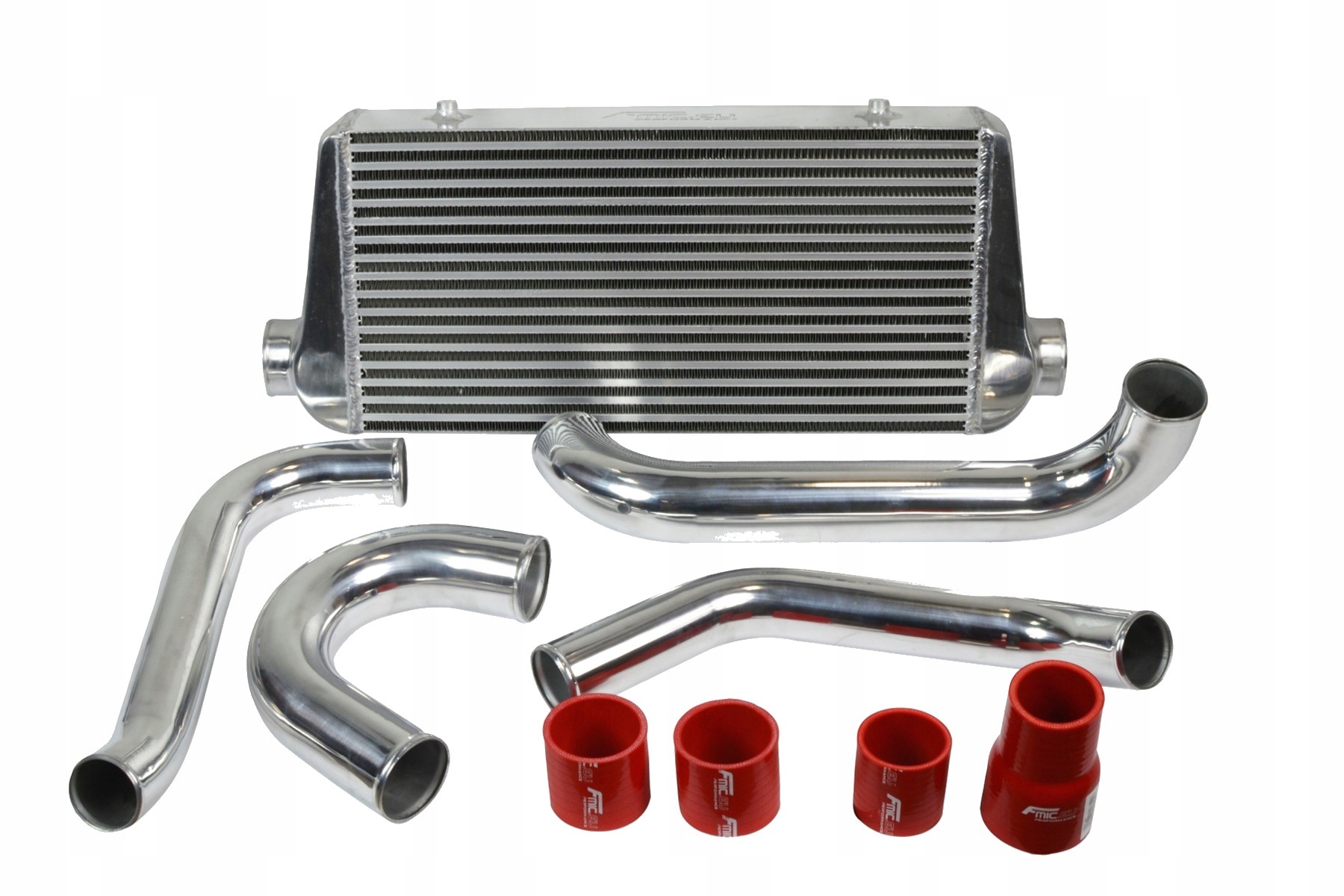комплект, призначений для Toyota Supra MK4, складається з правильно нарізаних і контурних труб, а також силіконових і алюмінієвих колін, інтеркулер має кріплення до кузова автомобіля. У комплект входять всі деталі, необхідні для правильної установки інтеркулера в автомобілі. Рекомендується установка в тюнінгової майстерні. Інтеркулер з розмірами сердечника: 600x300x76mm, всього: 780x300x76mm, з діаметром входу/виходу 76mm, достатнім для потужності 900km. Він має високоефективний сердечник, товсті стінки з високоякісного полірованого алюмінію, що гарантує величезну міцність, відмінне охолодження, а також відмінні повітряні потоки (на відміну від інтеркулерів від фургонів, вони не "забивають" повітрозабірник). Він блискуче замінює серійний інтеркулер, підвищуючи продуктивність автомобіля. Наші інтеркулери Allegro були протестовані до 5 бар-навіть такий великий тиск не вразив їх. На відміну від аналогічних інтеркулерів від Allegro, всі кулери, що продаються на наших аукціонах, мають нове, набагато більш ефективне ядро другого типу! Старий сердечник, видимий праворуч, мав дуже рідко розташовані ребра, до того ж тільки в один ряд (якщо дивитися через впускний отвір, було видно вихідний отвір), що призводило до поганого охолодження - проходить через нього повітря не віддавав всього тепла. Пропоновані на наших аукціонах інтеркулери мають більш щільний, що чергується радіатор, що гарантує величезне поліпшення охолодження! Крім того, зовнішній радіатор, видимий вище, має додатково надрізані (вентильовані) ребра, тому він набагато швидше віддає своє тепло.е>
