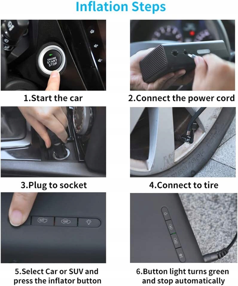 вибір моделей в один клік цей насос для шин підходить для надування автомобільних шин і позашляховиків. Вгорі знаходиться кнопка вибору моделі автомобіля і позашляховика. Moesz вибере модель для надування за допомогою одного кліка. Надування шин відбувається швидше, просто натискаючи кнопку і накачуючи однією кнопкою. Обидві сторони повітряного насоса оснащені 2000 maych повітрозабірників, які швидко поставляють повітря в циліндр, що значно покращує швидко надувати. цей автомобільний розпилювач повітря повинен бути поданий тільки в гніздо автомобільного прикурювача. Оснащений запобіжником на 10 а, він автоматично відключає живлення після витоку і захищає гніздо автомобільного прикурювача. Moesz надуває 5 шин цей насос для шин moe буде використовуватися постійно і ефективно протягом 30 хвилин a take moe надуває 5 шин дикий, щоб ви могли реагувати на голі аварії, не чекаючи. Вбудований світлодіодний світильник Wild вбудований світлодіодний світильник moesz atwo перевірить стан шин, навіть якщо ви працюєте в тінистому гарау, припаркованому під пошкодженими вуличними ліхтарями, або закріпитеся на необвітренной сільській дорозі.е>