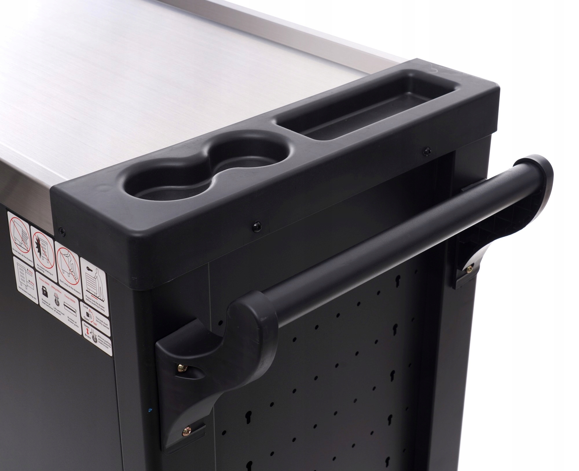 Допомагає підтримувати порядок на робочому місці та захищає інструменти від крадіжки (візок закривається на ключ). Тумба має ергономічну ручку, інтегровану в бічну стінку, надійно закріплену, що полегшує транспортування. повністю висувні ящики на підшипниках. Центральний замок з двома ключами для замикання всіх ящиків і двома ключами від бардачка. Він оснащений 4 колесами, включаючи 2 поворотних, що полегшує маневрування шафою. що робить транспортування дуже легким. Додатково має кутові бампери (захищають від випадкових пошкоджень, наприклад, кузова). верх з авіаційного алюмінію! має універсальну перфорацію. У набір входить порожнє дворівневе відділення для речей, що замикається. У набір входять комбіновані та торцеві ключі типу L, виготовлені з хромованадієвої сталі CrV6140. Тріскачки оснащені системою QUICK RELASE і механізмом на 72 зуба. Нова шафа, не використовувалася.