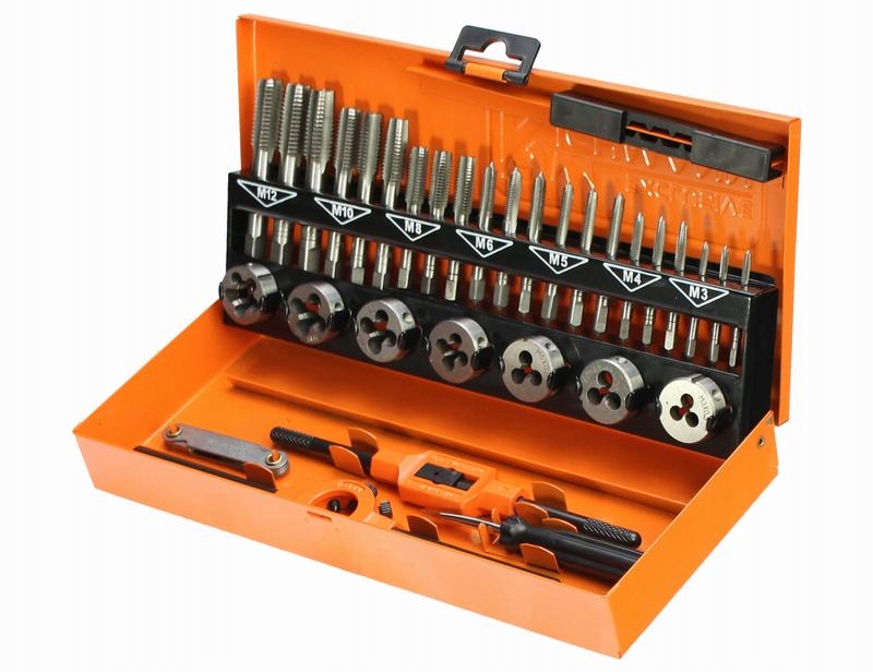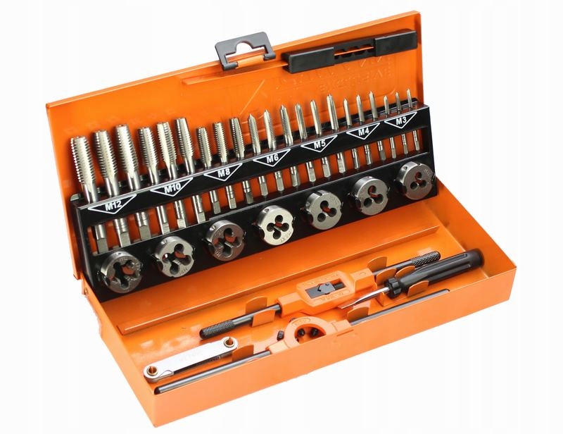 набор метчиков и плит C9182 фирмы Richmann Exclusive предназначен для любых промышленных, мастерских и хобби. Комплект может быть успешно использован как для нарезания резьбы, так и для ремонта внутренней и внешней резьбы. В комплект входят все необходимые держатели для плашки и метчика, а также металлический ящик для хранения и транспортировки инструментов.п>