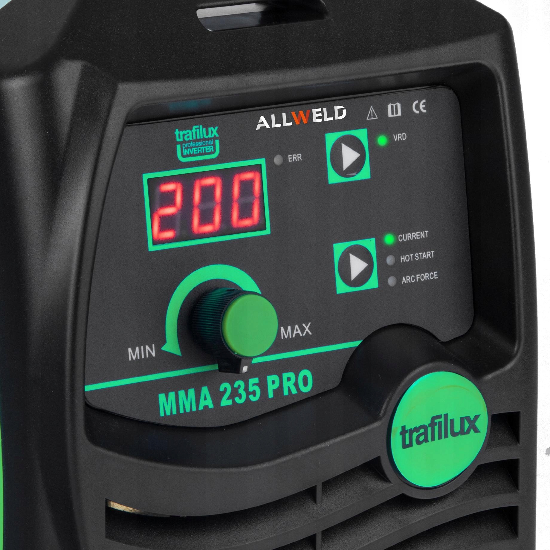 TRAFILUX MMA 235 Pro зварювальний апарат-це легкий і портативний електродний зварювальний апарат. Це дозволяє нам зварювати електродами, покритими різними сортами звичайних, нержавіючих, жароміцних і чавунних сталей.е> оптимальні розміри і вага