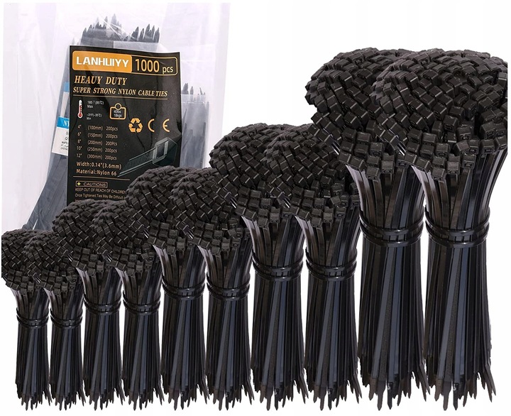 великий набір кабельних стяжок < /B>: 1000 шт.чорних кабельних стяжок 100/150/200/250/300 мм x 3,6 мм, Кабельні стяжки, стійкі до ультрафіолетового випромінювання. Різні розміри-сортуються в окремі мішечки.Чи>