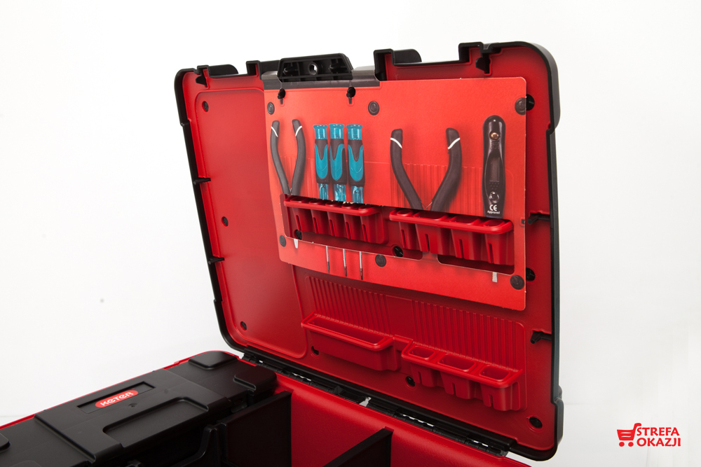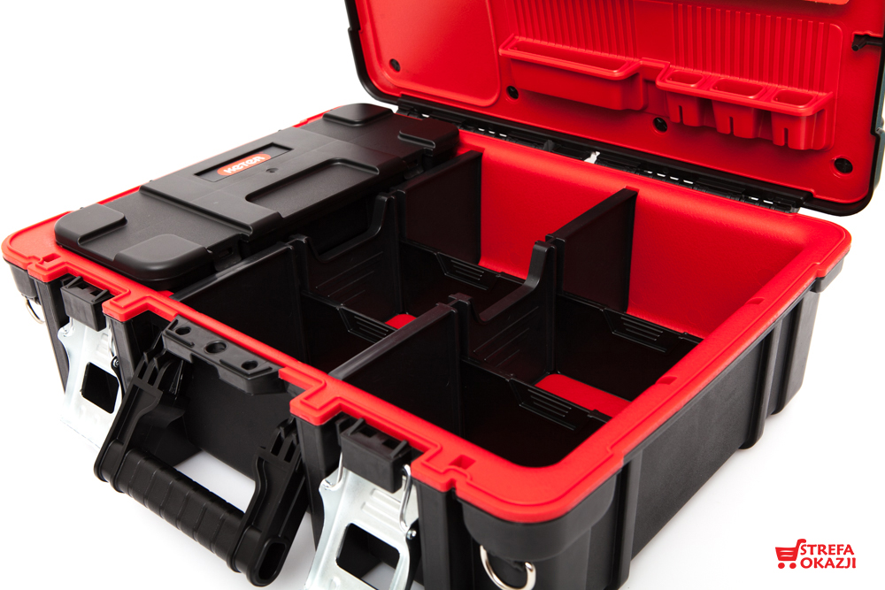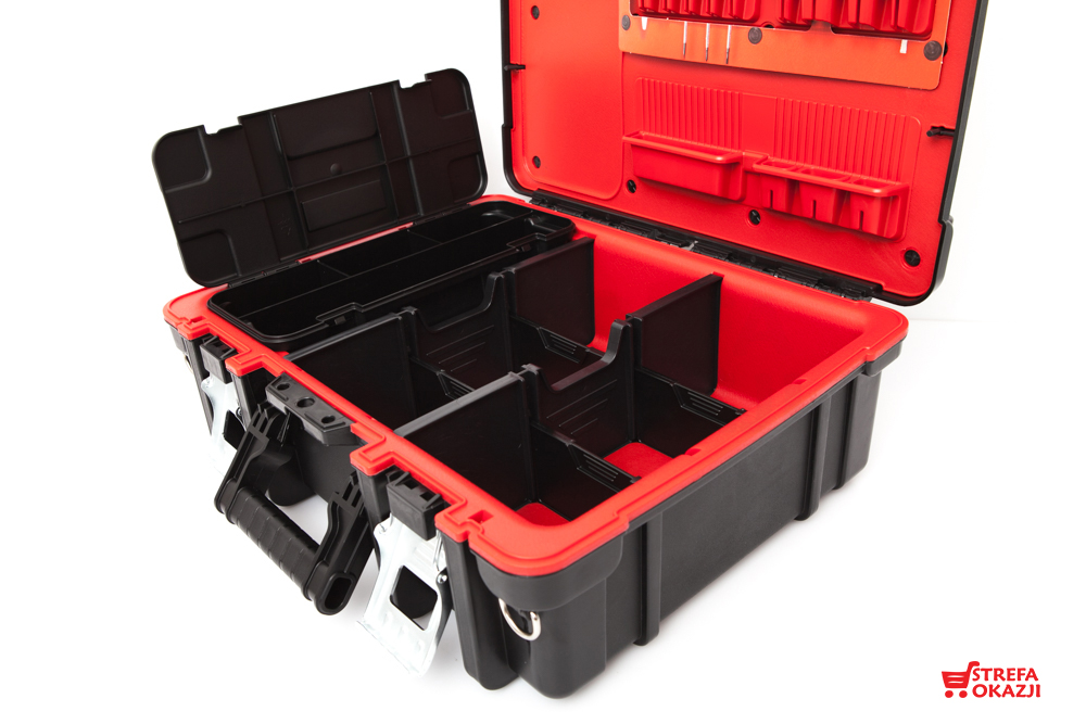 практична коробка великої ємності . Його внутрішня частина дозволяє легко зберігати інструменти різних розмірів, органайзер, розташований в ящику, дозволяє легше отримати доступ до цих найбільш часто використовуваних інструментів. Крім того, виріб оснащений знімним органайзером з відділеннями. Завдяки зручній ручці ящик можна без проблем транспортувати. Виріб виготовлено з високоякісних матеріалів, що забезпечує його довговічність і міцність.