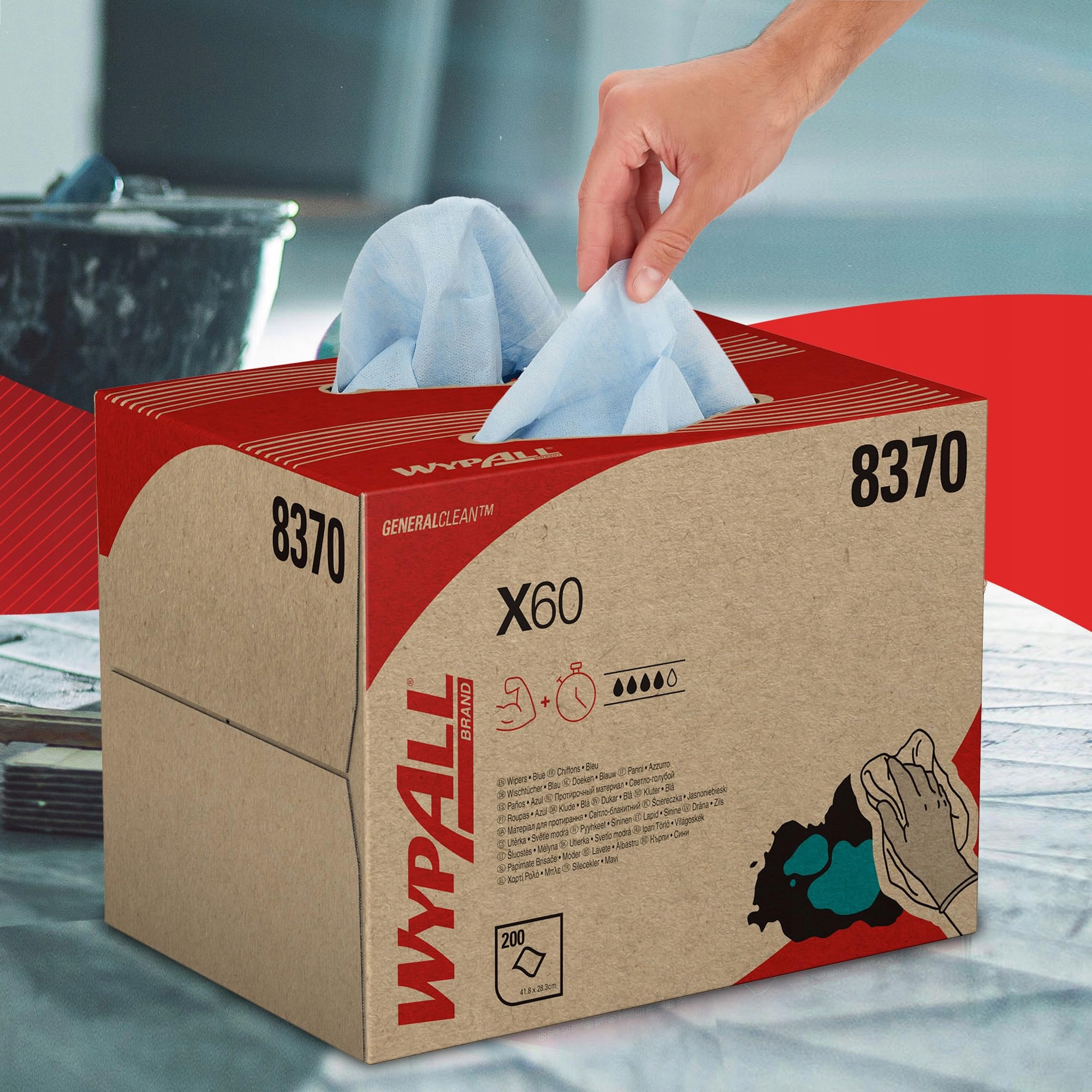 маркована точка : кожен спливаючий пакет містить 200 синіх одношарових серветок, призначених для для очищення, дезінфекції та загальних завдань гігієни праці; технологія Advanced Hydrotket забезпечує швидке поглинання та довговічність цих серветок для тривалого використання; серветки WypAll X60 призначені для професійного прибирання, виробництва, а також для використання в якості промислових серветок. Серветки Blue ідеально підходять для очищення легкої мастила та бруду, Поставляється в системі висувних коробок, з подачею одного аркуша, завданням якого є покращення гігієни шляхом мінімізації забруднень серветки для очищення