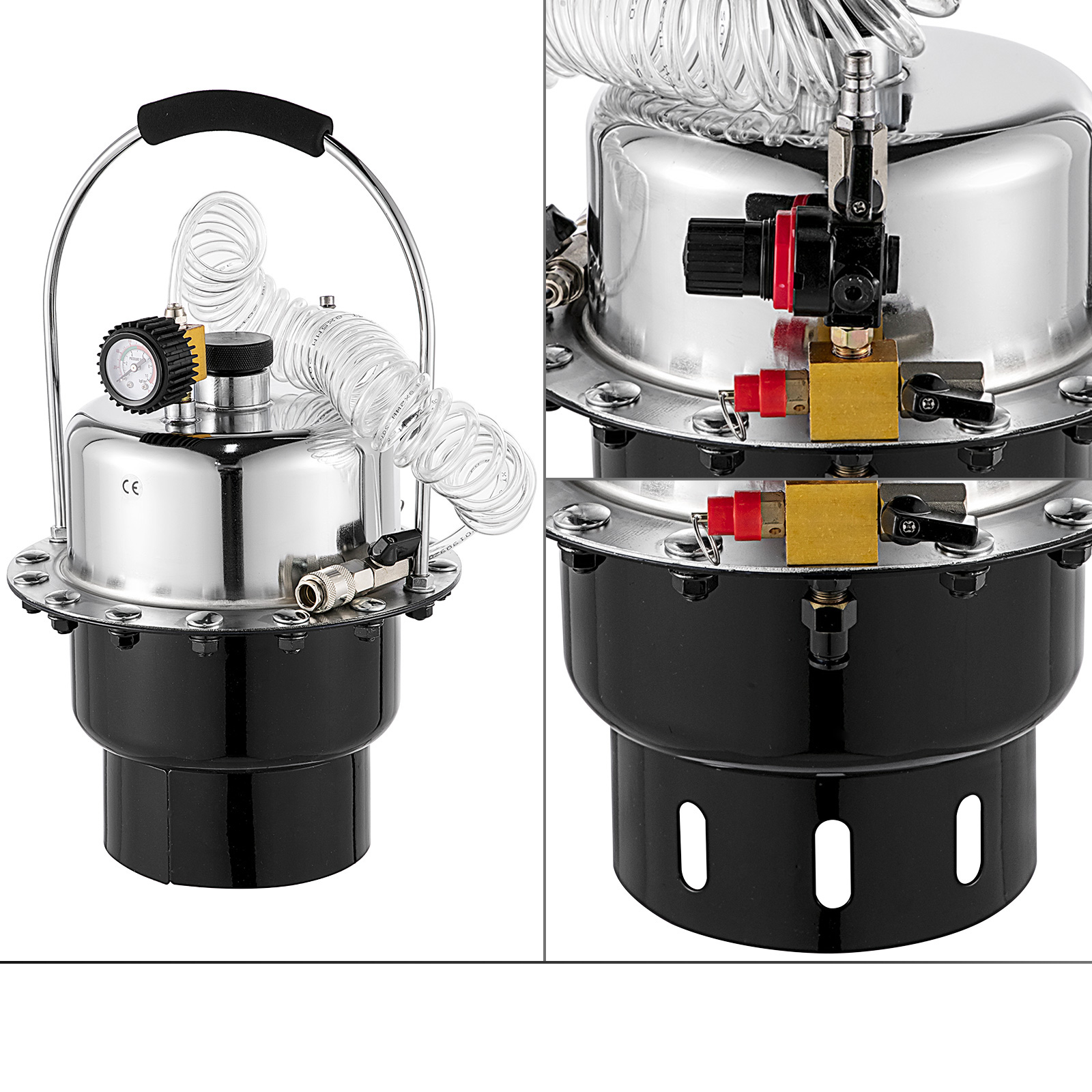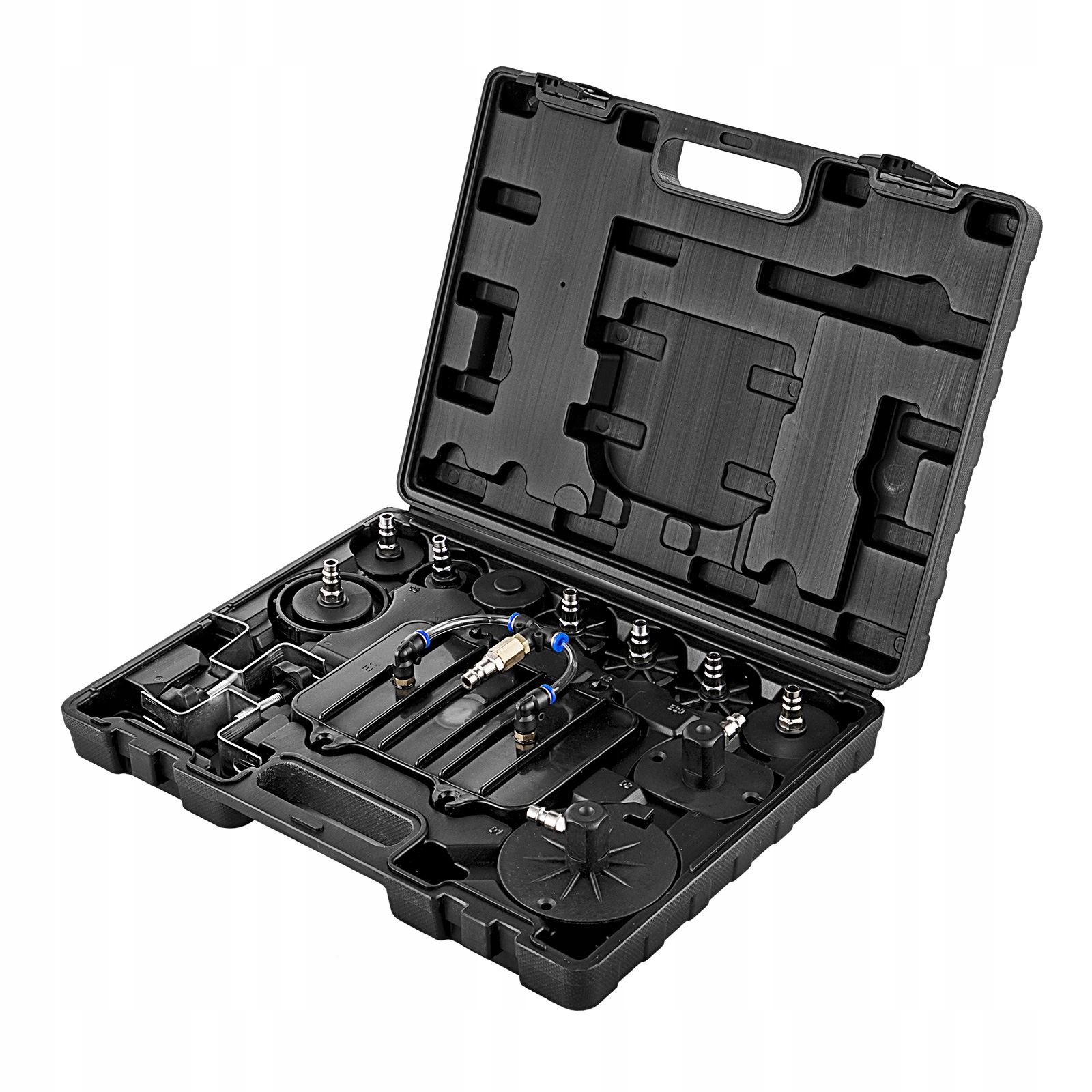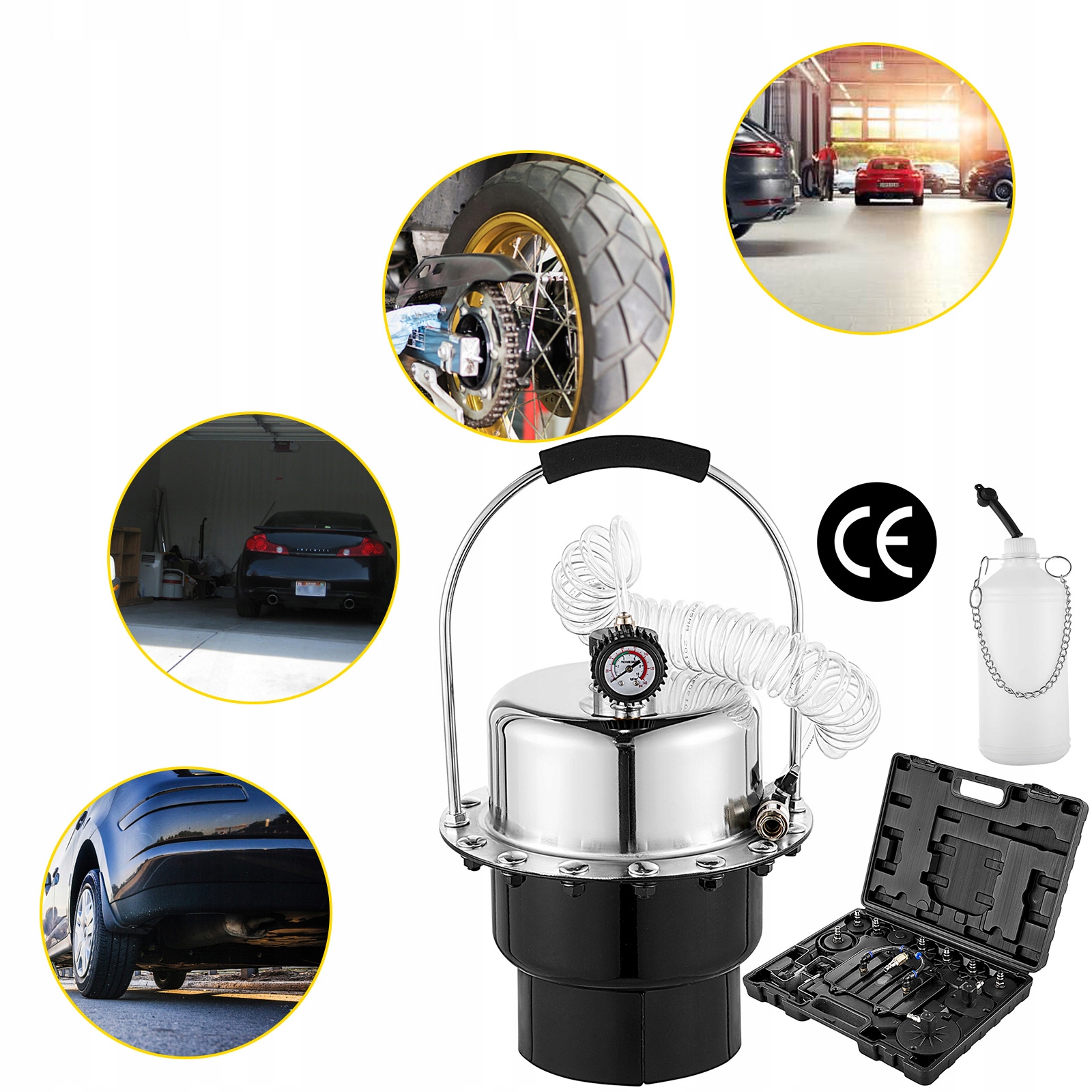 комплект для прокачування гальм підходить для операцій заміни масла в гідравлічних гальмах транспортних засобів і гідравлічних муфтах великих транспортних засобів. Ця машина з газовим баком живиться стисненим повітрям, що дозволяє багаторазово замінювати масло за один заряд газу. Робочий манометр, яким оснащена машина, можна налаштувати відповідно до ваших потреб.