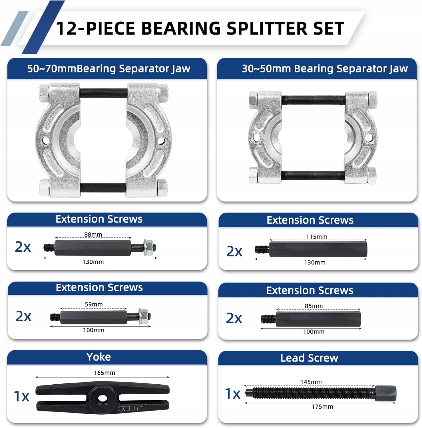 Вузел сепаратора підшипників складається з губки сепаратора підшипників 50-70 мм, губки сепаратора підшипників 30-50 мм, опори 165 мм, установочного гвинта 175 мм, чотирьох подовжуючих гвинтів 100 мм і чотирьох подовжуючих гвинтів 130 мм. 2-тонна ємність подвійних підшипникових роздільних губок гарантує, що вони можуть витримувати інтенсивне використання; Підходить для професіоналів і любителів механіки, сумісний з більшістю транспортних засобів, гірських велосипедів і легких вантажівок. МІЦНА КОНСТРУКЦІЯ: виготовлений із термообробленої Cr-V сталі з чорним оксидним покриттям, цей набір знімачів підшипників шестерень забезпечує тривалу стійкість до корозії та довговічність при регулярному та складному використанні. Знімач підшипників: ідеально підходить для зняття великих і малих підшипників з осей втулки передніх і задніх коліс, а також шестерень, шківів і маховиків. Включає міцний пластиковий футляр із ручкою та засувками для безпечного транспортування, зручного зберігання та швидкої організації.