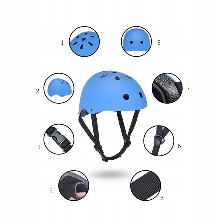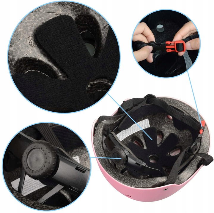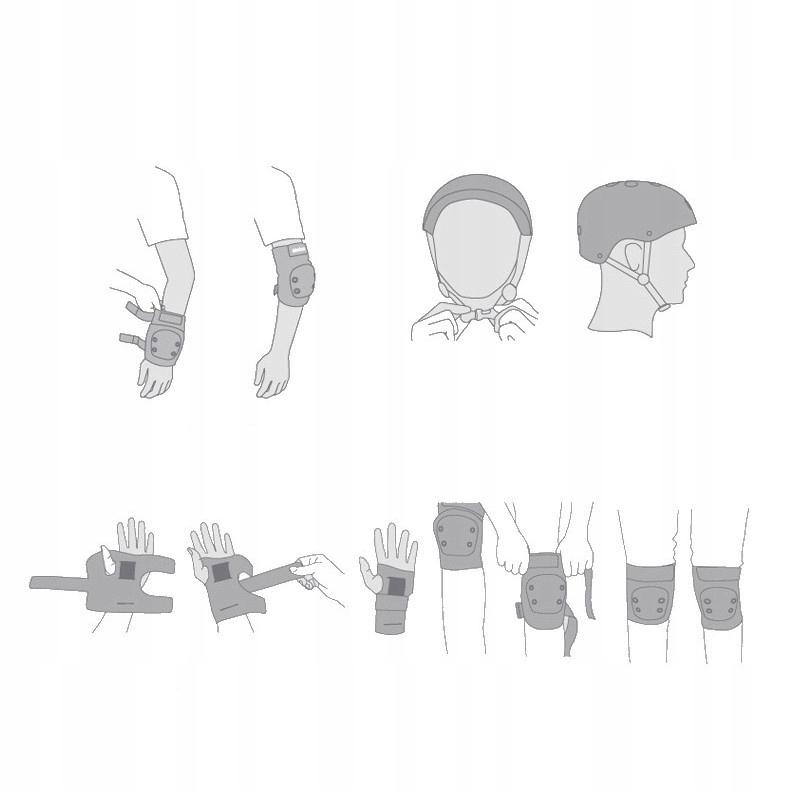 Регульований шолом, регульований ремінь шолома та наколінники Захисти для ліктів Захисти для зап’ястя Еластичні ремінці із застібкою на липучці полегшують надягання та зняття шолома.