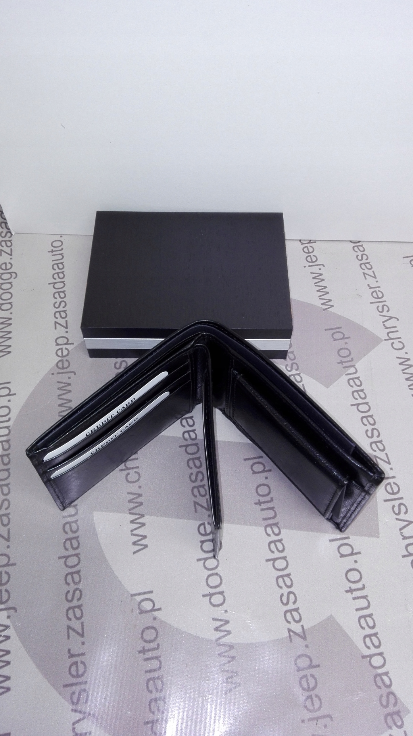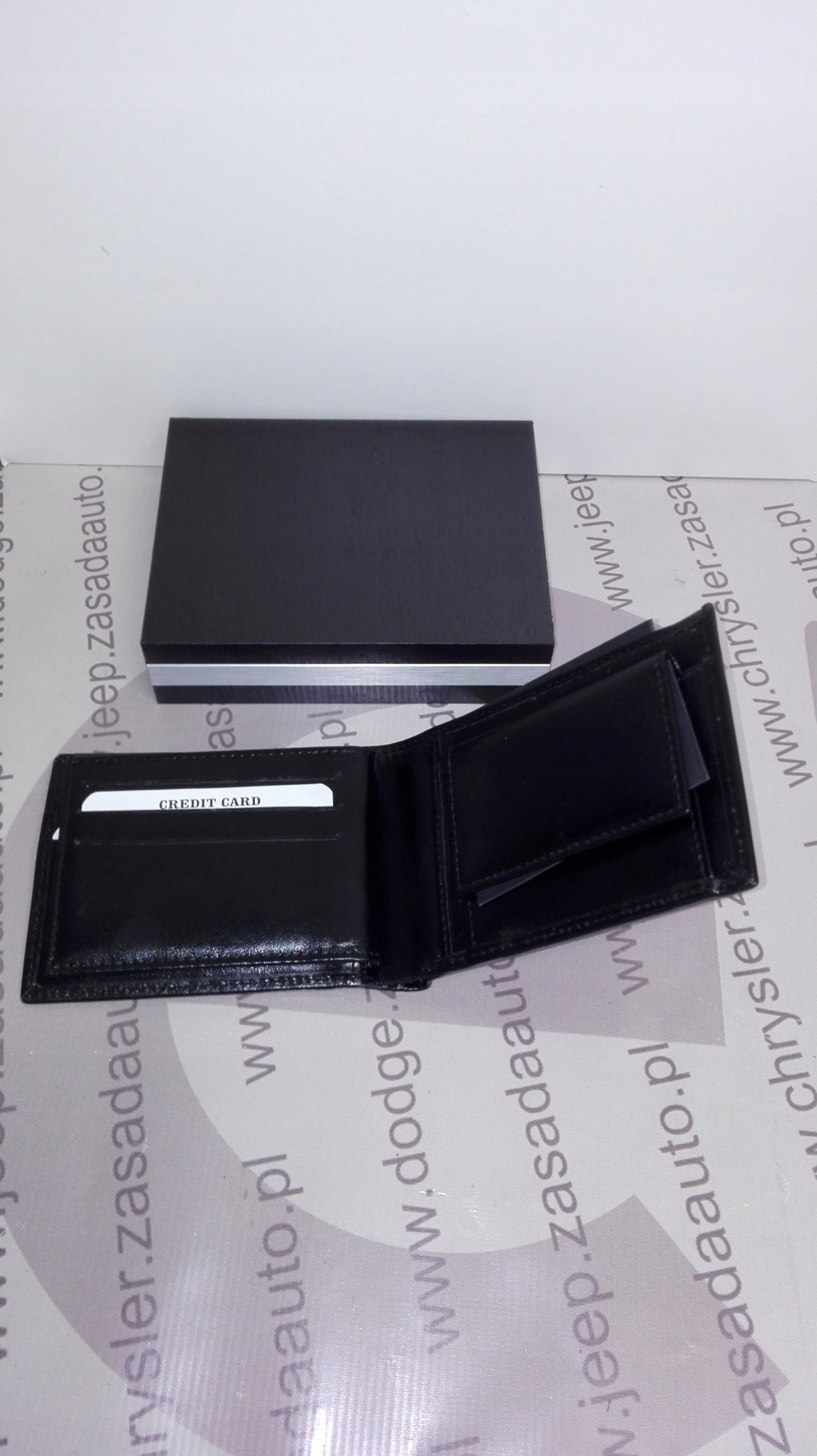 гаманець оснащений двома відділеннями для банкнот, десятьма відділеннями для кредитних карт і трьома кишенями для документів. На зовнішньому люку нанесений логотип марки Jeep. Упакований в дерев'яну коробку.