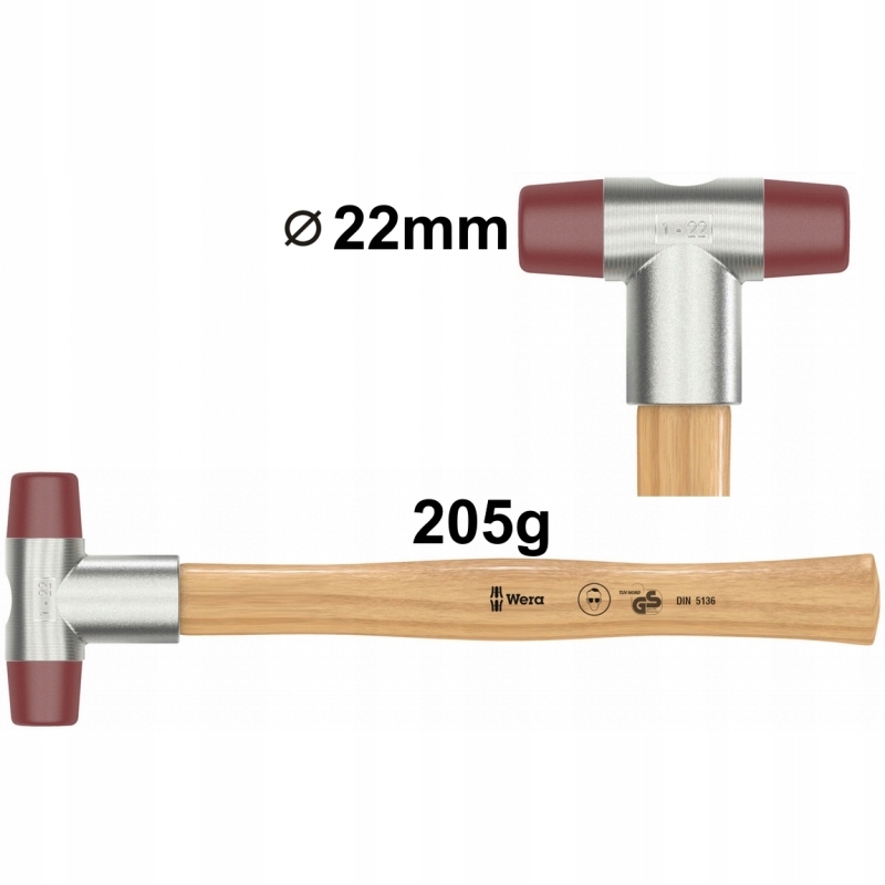 Молоток із пластиковою головкою: двосторонній конічний клин гарантує безпечне та надійне з'єднання ручки молотка і головки. Уретанові головки середньої жорсткості. Ручка виготовлена з високоякісного ясена. Універсальне використання завдяки змінним пластиковим головкам. Для кузовів, автомеханіки, машинобудування.