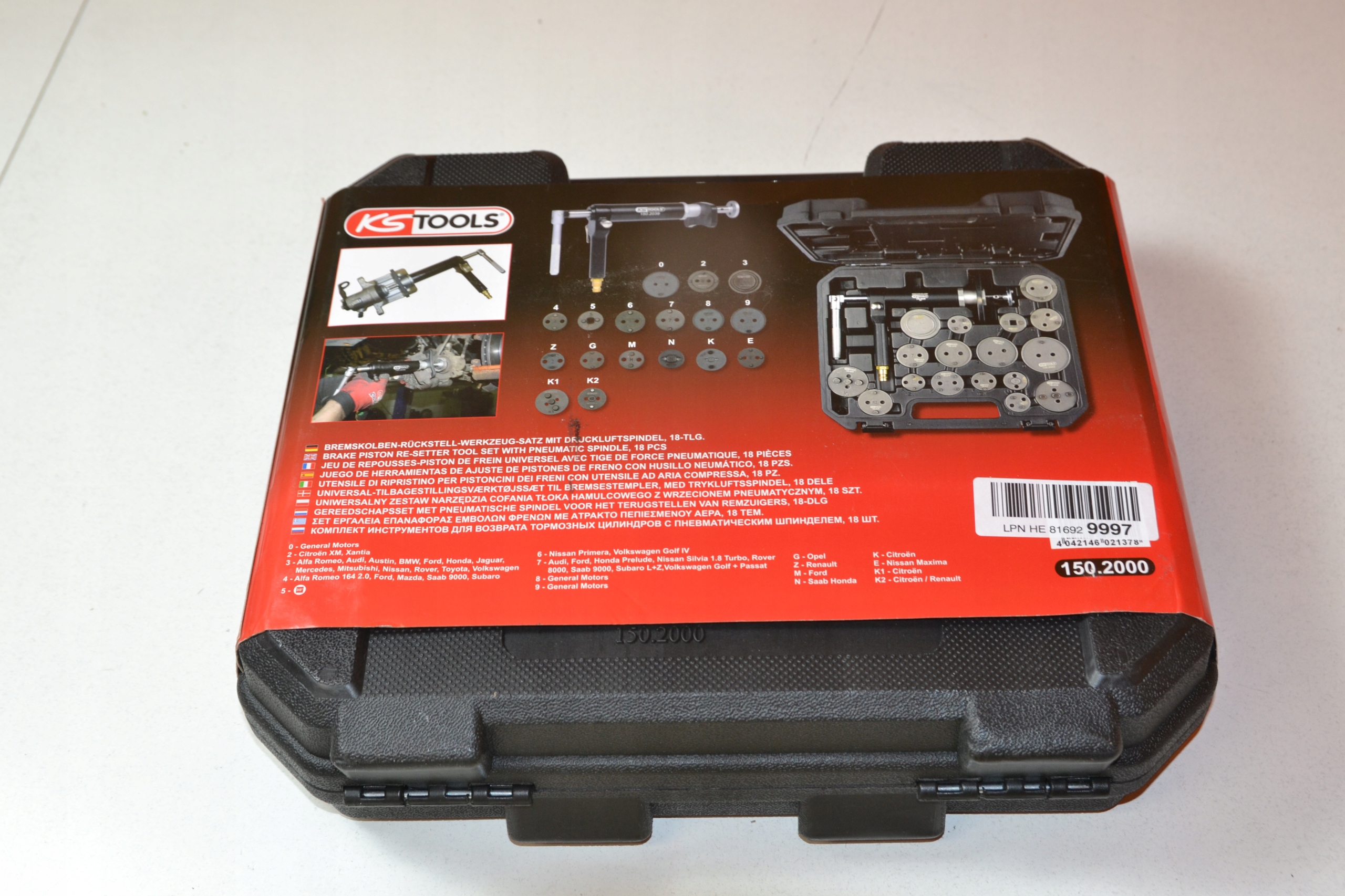 - правосторонній і лівосторонній - ідеальний для безушкодженого руху поршня дискового гальма - Користувач визначає напрямок обертання за допомогою кутового елемента на кінці шпинделя - Автоматичний компенсація різного кроку різьби завдяки використанню безступінчастого шпинделя - комфортна та швидка робота завдяки використанню пневматичного шпинделя - З'єднувальні пластини з колекторами для отворів у гальмівному поршні - пронумеровані з’єднувальні пластини забезпечують правильне призначення – з універсальним шпиндельним з’єднувачем з магнітною монтажною пластиною шпинделя – переважно для використання на задніх осях із дисковими гальмами – піскоструминна поверхня – спеціальна інструментальна сталь – у міцному пластиковому футлярі Застосування: 0 – General Motors 2 – Citroën XM, Xantia та ін. 3 - Alfa Romeo, Audi, Austin, BMW, Ford, Honda, Jaguar, Mercedes, Mitsubishi, Nissan, Rover, Toyota, Volkswagen 4 - Alfa Romeo 164 2.0, Ford, Mazda, Saab 9000, Subaro 5 - роз'єм з внутрішнім квадратним приводом 3/8" 6 - Nissan Primera, Volkswagen Golf IV 7 - Audi, Ford, Honda Prelude, Nissan Silvia 1.8 Turbo, Rover 8000, Saab 9000, Subaro L+Z,Volkswagen Golf + Passat 8 - General Motors 9 - General Motors G - Opel Astra Z - Renault M - Ford N - Saab Honda K - Citroën E - Nissan Maxima K1 - Citroën K2 - Citroën / Renault