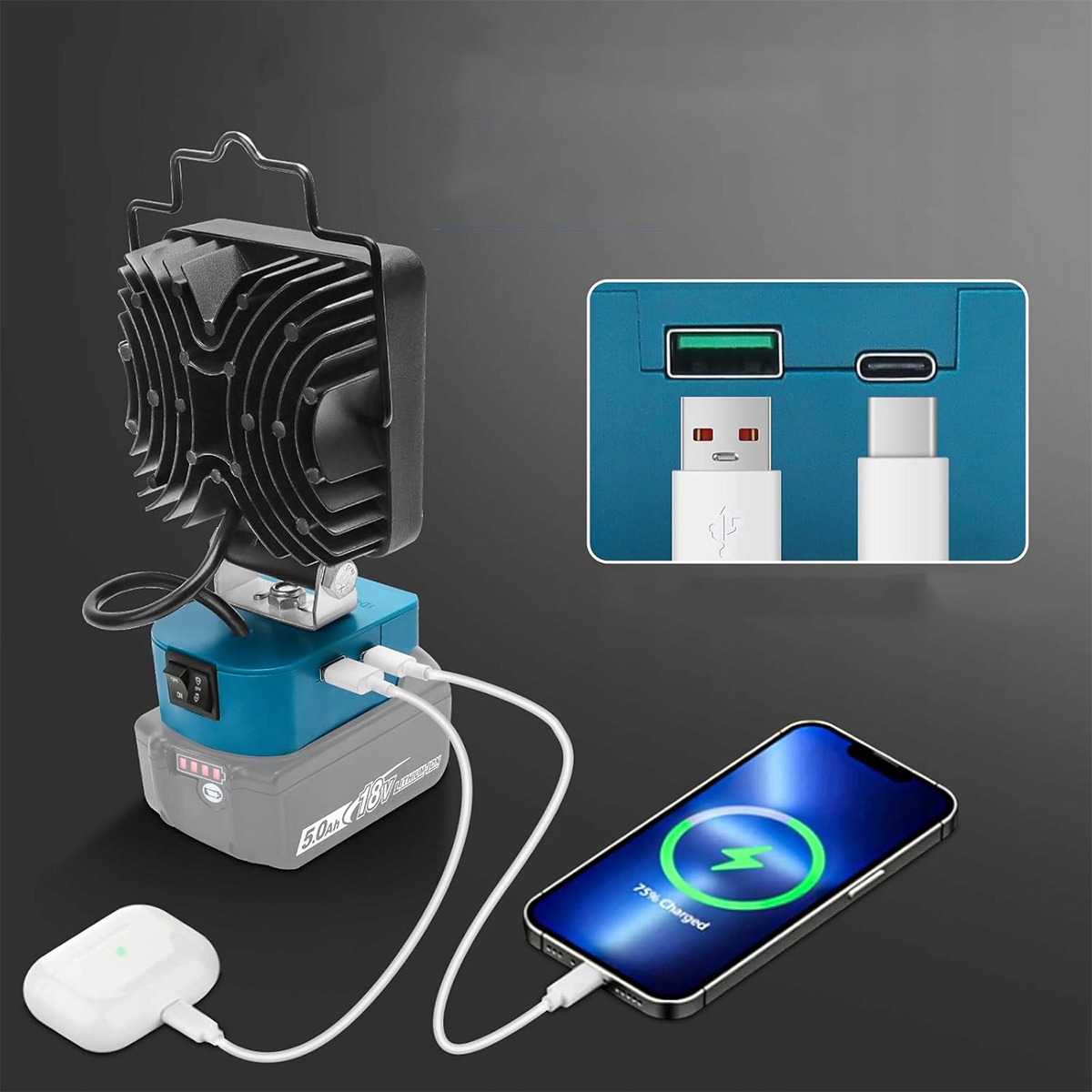 Цей перезаряджуваний світлодіодний робочий ліхтар Makita також виконує роль зарядного пристрою Makita. Порти USB-A і Type-C дозволяють заряджати два пристрої одночасно, що ідеально підходить для смартфонів, планшетів та інших невеликих електронних пристроїв. Скористайтеся перевагами різноманітних функцій цього прожектора з батарейним живленням як джерела світла та зарядного пристрою.