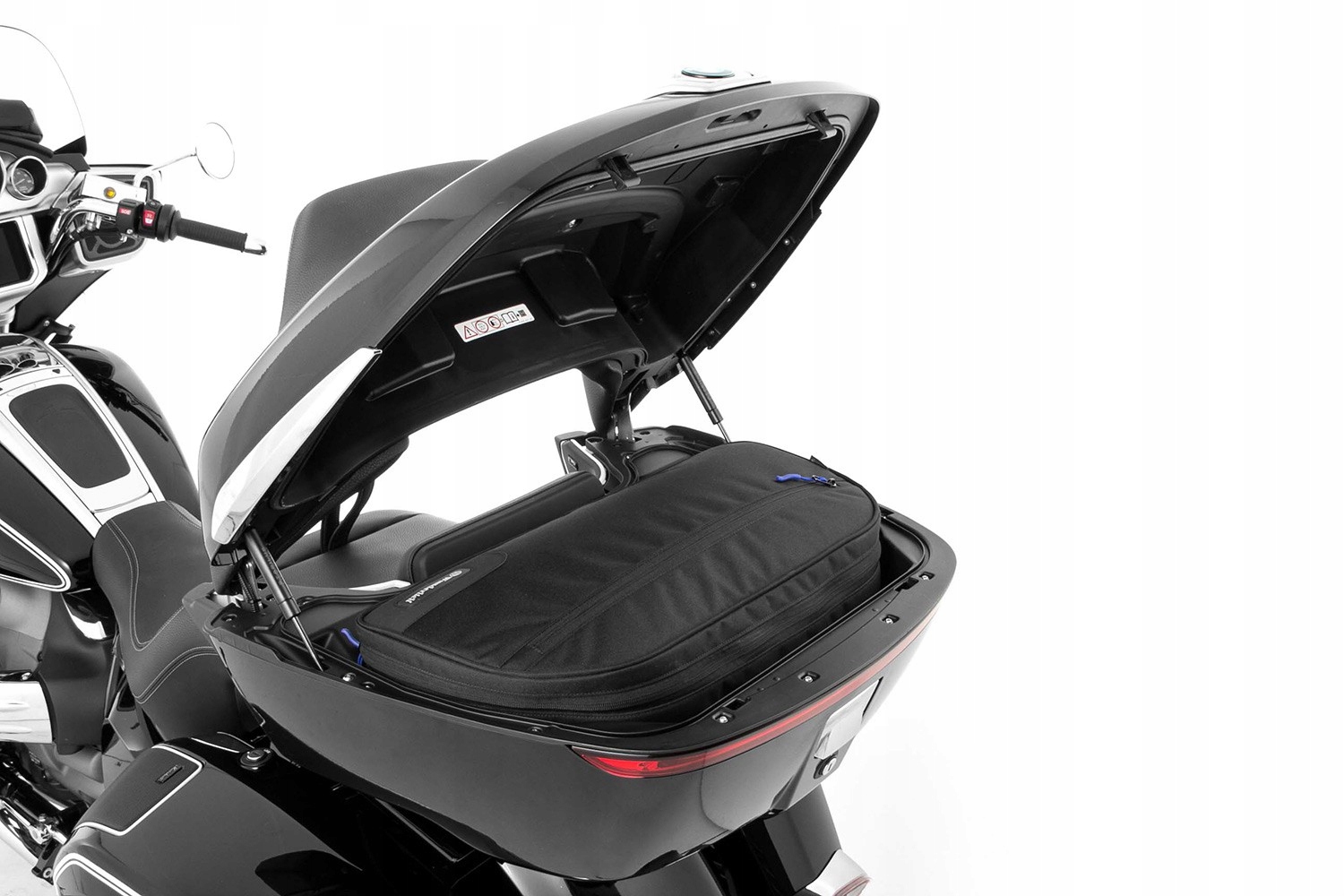 міцна чорна внутрішня сумка CORDURA® для верхніх скринь ідеально виготовлена і не залишає бажати кращого: оснащена синьою внутрішньою підкладкою, регульованим ременем для перенесення і ергономічною практичною ручкою для перенесення, ця сумка елегантно зібрана і також може використовуватися в якості дорожньої сумки. Поставляється з великою внутрішньою кишенею, яку можна закрити на блискавці. Ексклюзивний внутрішній Центральний кишеню для оригінального Центрального скрині BMW і центральних скринь аналогічної геометрії.