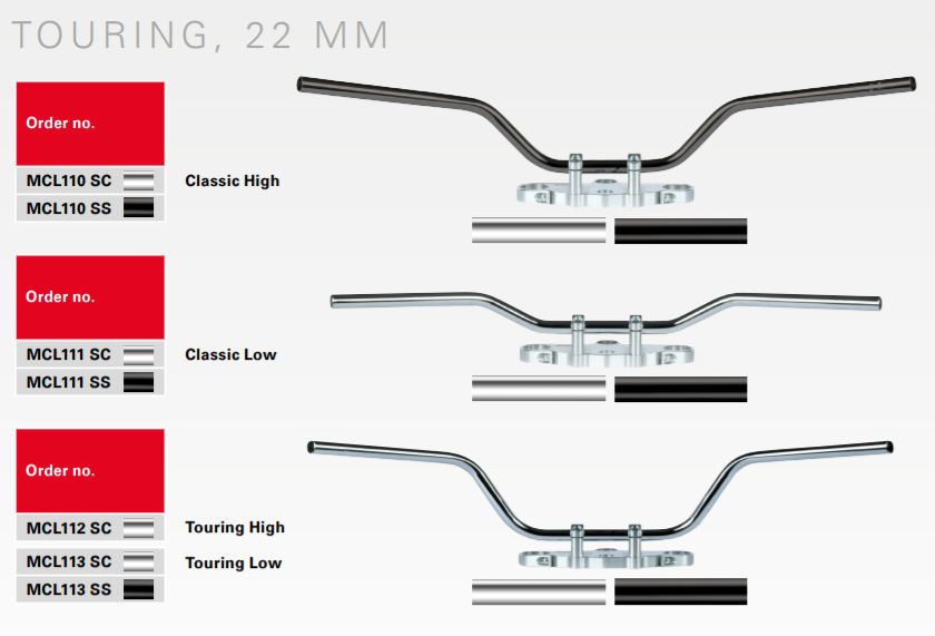 рулі практично для всіх мотоциклів, як для голих велосипедних машин, так і для туристичних мотоциклів, а також для нестандартних мотоциклів . Ми пропонуємо не тільки моделі діаметром 22 мм, але і сталеві рулі діаметром 25,4 мм (1 дюйм) для моделей Harley Davidson та інших нестандартних мотоциклів, доступні у версії з вирізами або кабельними отворами, які дозволяють приховати дроти і отримати більш естетичний вигляд.Чи>