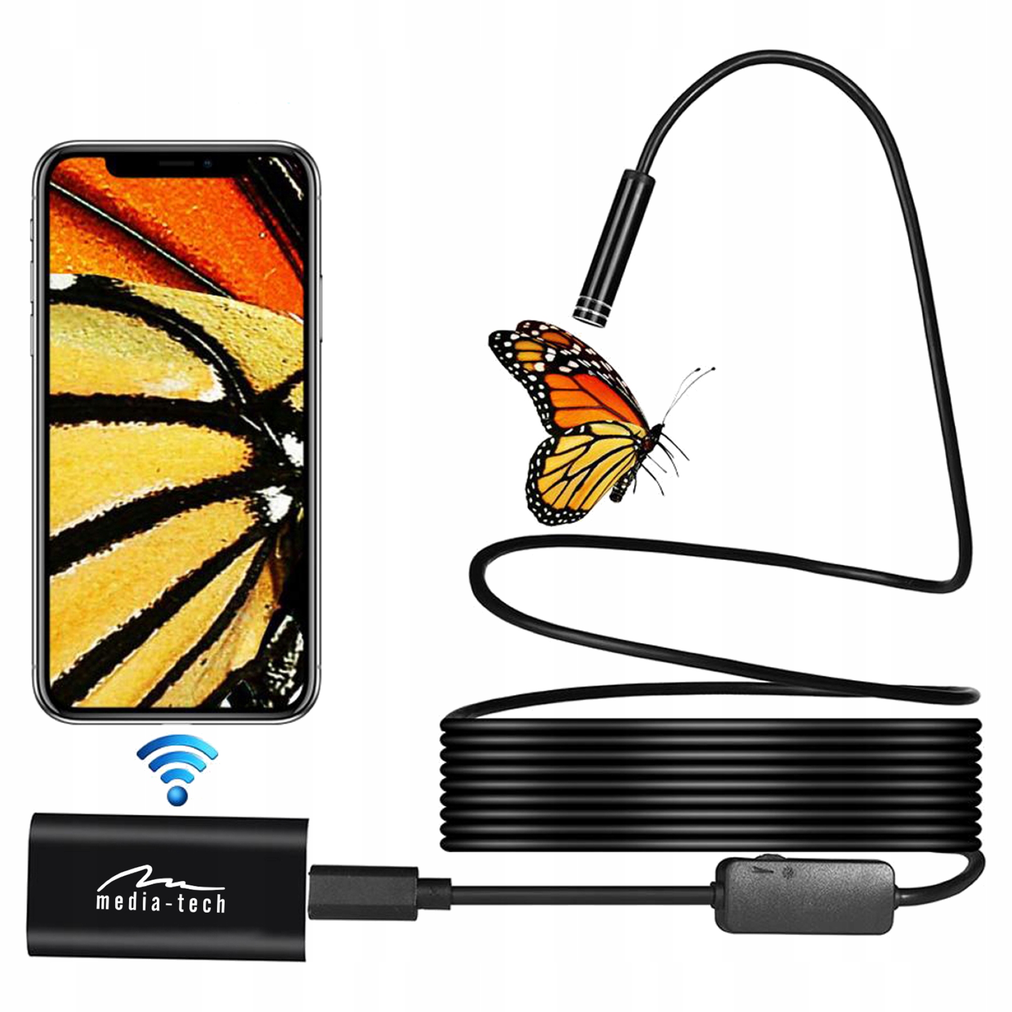 довгий (5 м) і гнучкий з'єднувальний кабель, дозволить ввести невелику інспекційну камеру (8 мм) у важкодоступне місце для отримання зображення на моніторі комп'ютера або екрані смартфона.е>