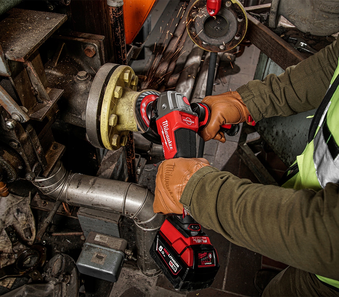 перша потужна акумуляторна кутова шліфувальна машина з регулюванням швидкості і нижнім лопатевим перемикачем (Deadman) з майстерні Milwaukee ® потужністю, еквівалентною 1200 Вт для мережевих (кабельних) шліфувальних машин