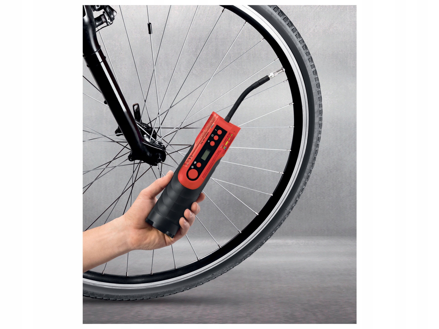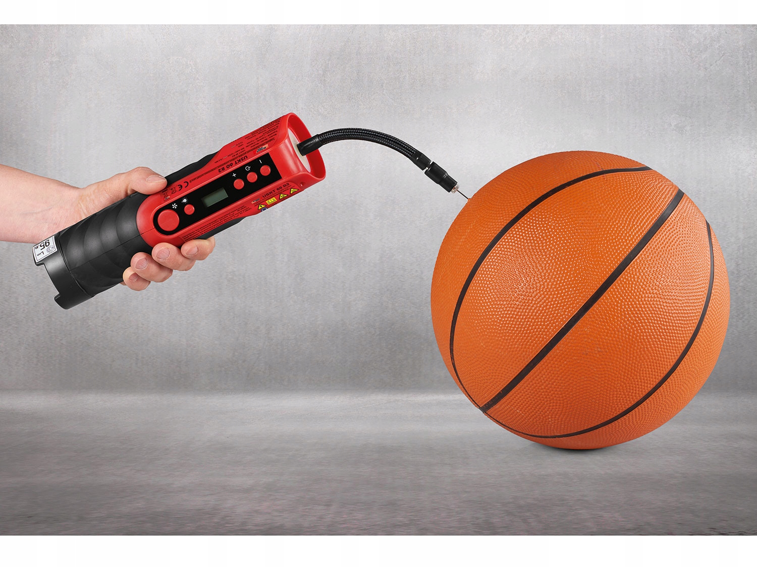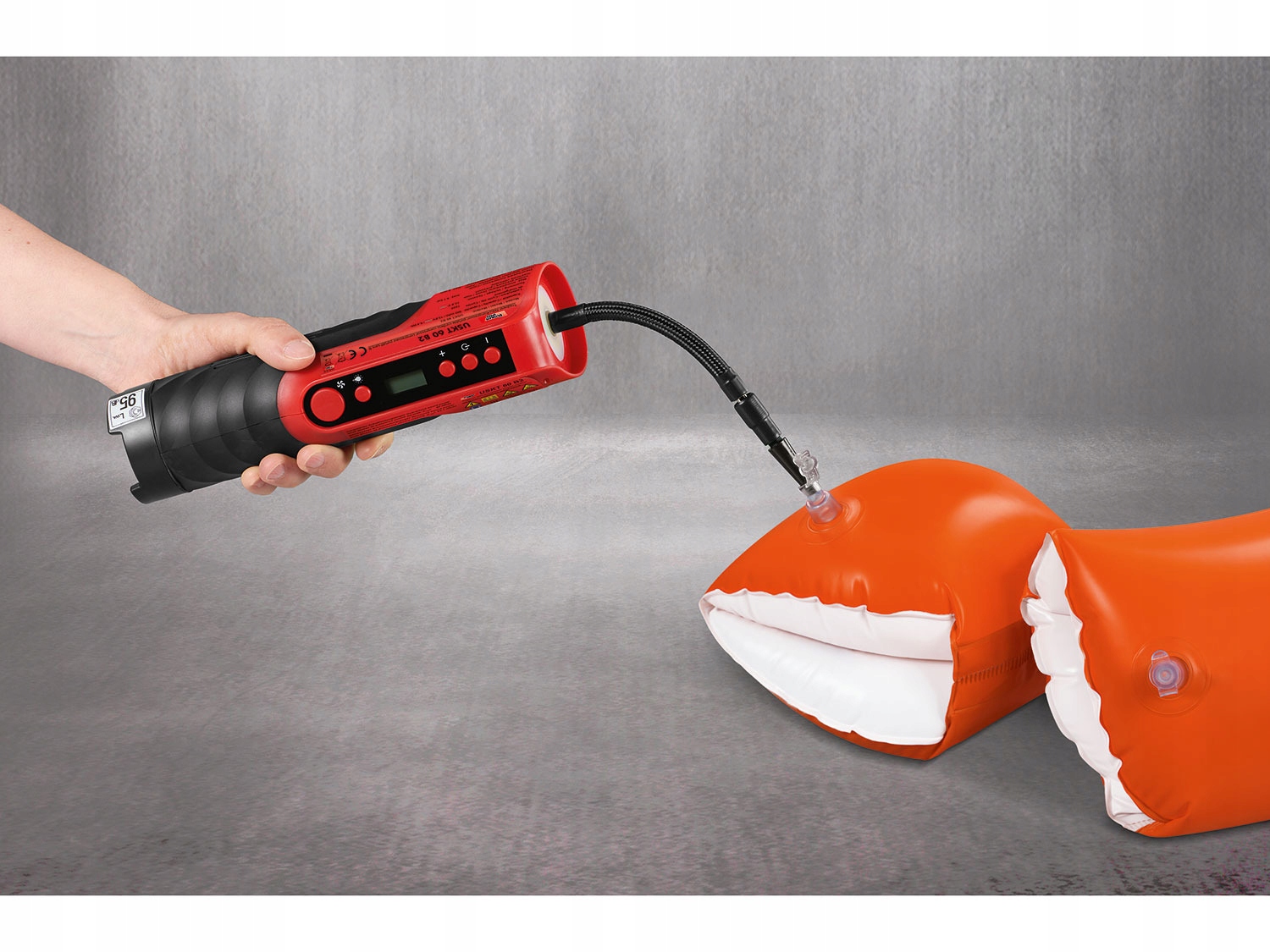 корпус містить шланг стисненого повітря з 4 перехідниками: автомобільний клапан (стаціонарно встановлений на шлангу), велосипедний клапан, голка для надування м'ячів, універсальний перехідник