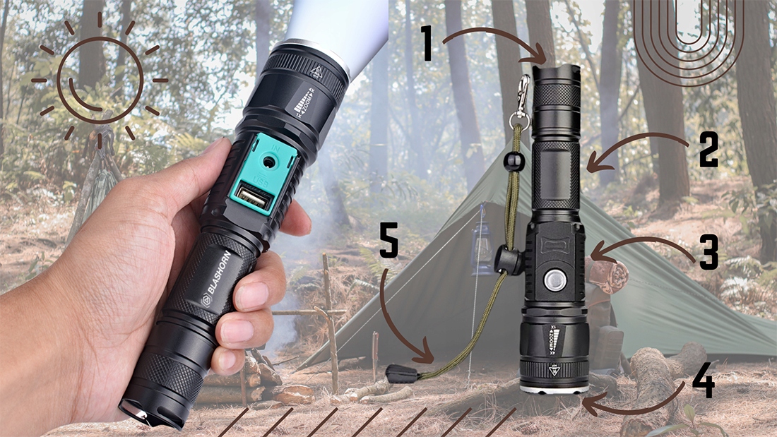 ➡️тактичний водонепроникний світлодіодний ліхтарик CREE XML-T6 з функцією ZOOM і POWERBANK BLASHORN