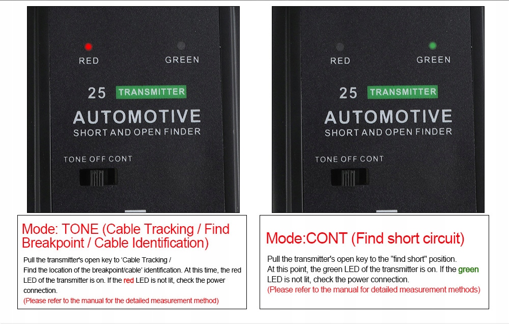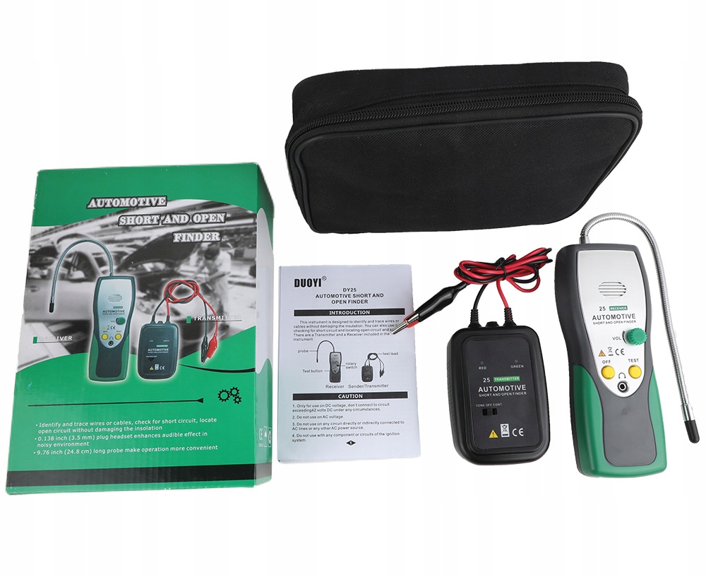 DY25 виявляє і негайно попереджає вас, де ланцюг розімкнута. Ви можете швидко і легко знайти короткі замикання, відкриті з'єднання, пошкоджені дроти, поточні витоку і навіть трасуючі дроти. Ви також можете знайти переривчасті проблеми з ланцюгами, згинаючи дроти або роз'єм і слухаючи для зміни тону приймача, що дозволяє вам відстежувати або вказувати місце розташування проблеми в цілому. Він також показує напрямок ярлика за допомогою покажчиків повороту, виключаючи здогади. Цей професійний інструмент буде працювати на всіх типах ланцюгів від 6 до 42 В постійного струму. Наприклад, знайдені в автомобілях, вантажівках, тракторах, човнах, автофургонах і т.д. з широким діапазоном робочої напруги