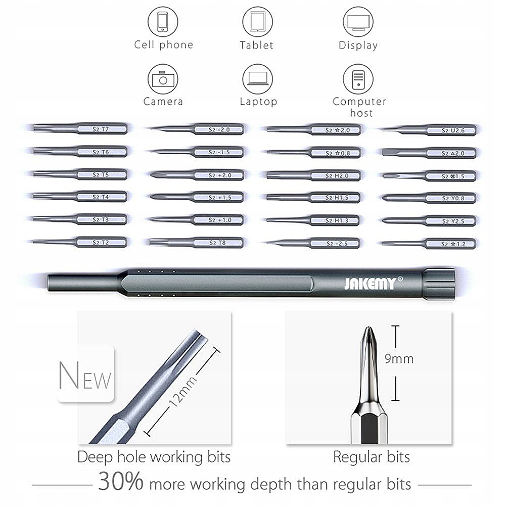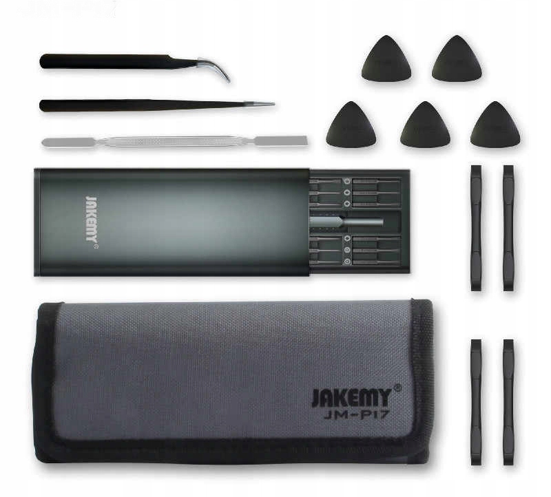 Jakemy JM-P17 ценабір з 36 інструментів в тому числі24 прецизійних магнітних біта з легким алюмінієвим тримачем призначений для точного ремонту телефонів і смартфонів, включаючи продукти Samsung, Huawei, Xiaomi, Oppo і Apple, тобто iPhone, MacBook Air і Pro.